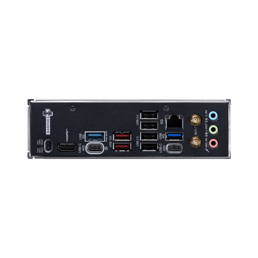 1 x Clear CMOS button, 1 x Flash BIOS Button, 1 x HDMI, 1 x RJ45, 1 x Thunderbolt 4, 1 x USB 3.2 Gen 2x2 Type-C, 2 x USB 10Gbps port (2 x Type-A), 2 x USB 5Gbps ports (2 x Type-A), 3 x Audio, 4 x USB 2.0, HDMI, Thunderbolt, Wi-Fi / Bluetooth Antenna