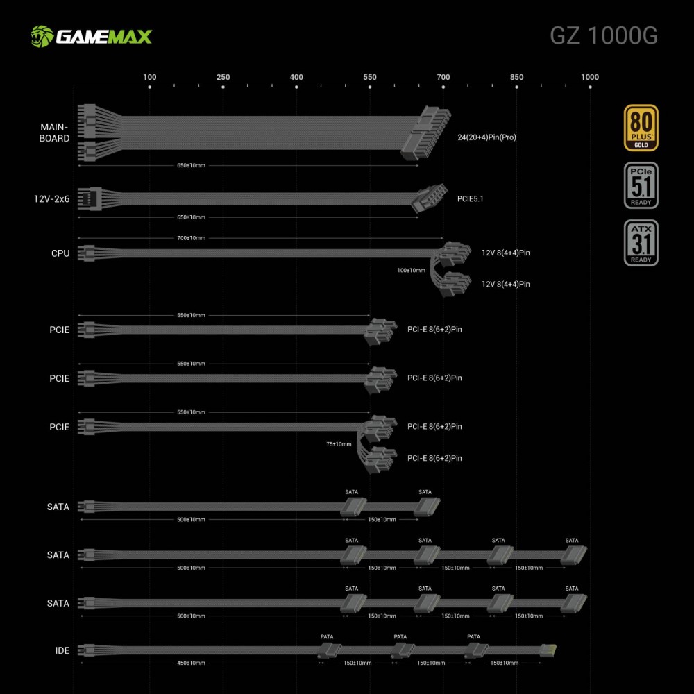 Блок живлення 3.1 & PCIe5.1_ 1000W, 80+ Gold, fan 135mm,fully modular ,Japanese 105°C and solid GZ 1000G BK GAMEMAX (GZ 1000G BK)