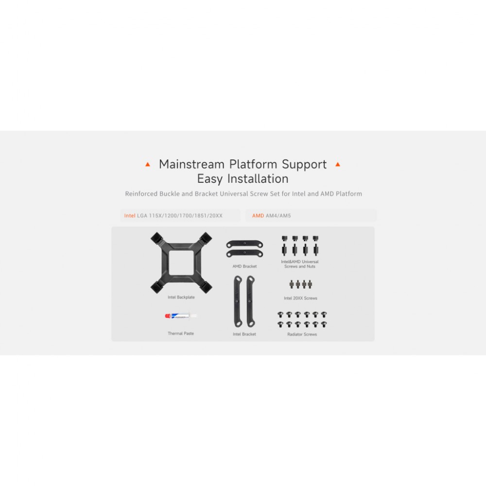 Сумісність із сокетами: PCcooler DA360 ARGB BK підтримує широкий спектр сокетів процесорів, включаючи Intel LGA 115x, 1200, 1700, 20xx, а також AMD AM4 та AM5. Це робить його універсальним рішенням для сучасних систем.