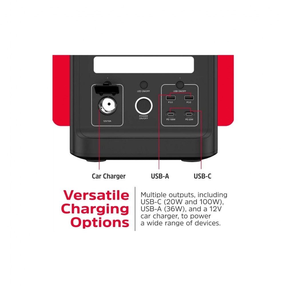 Станція Energizer PPS1500W2F оснащена двома розетками змінного струму 220-240 В 50 Гц/60 Гц, одним автомобільним портом 12 В/10 А, двома портами USB-А загальною вихідною потужністю 36 Вт, двома портами USB-C, один з яких підтримує протокол швидкого заряджання PD 100W, інший зарядить підключений пристрій з потужністю до 20 Вт.