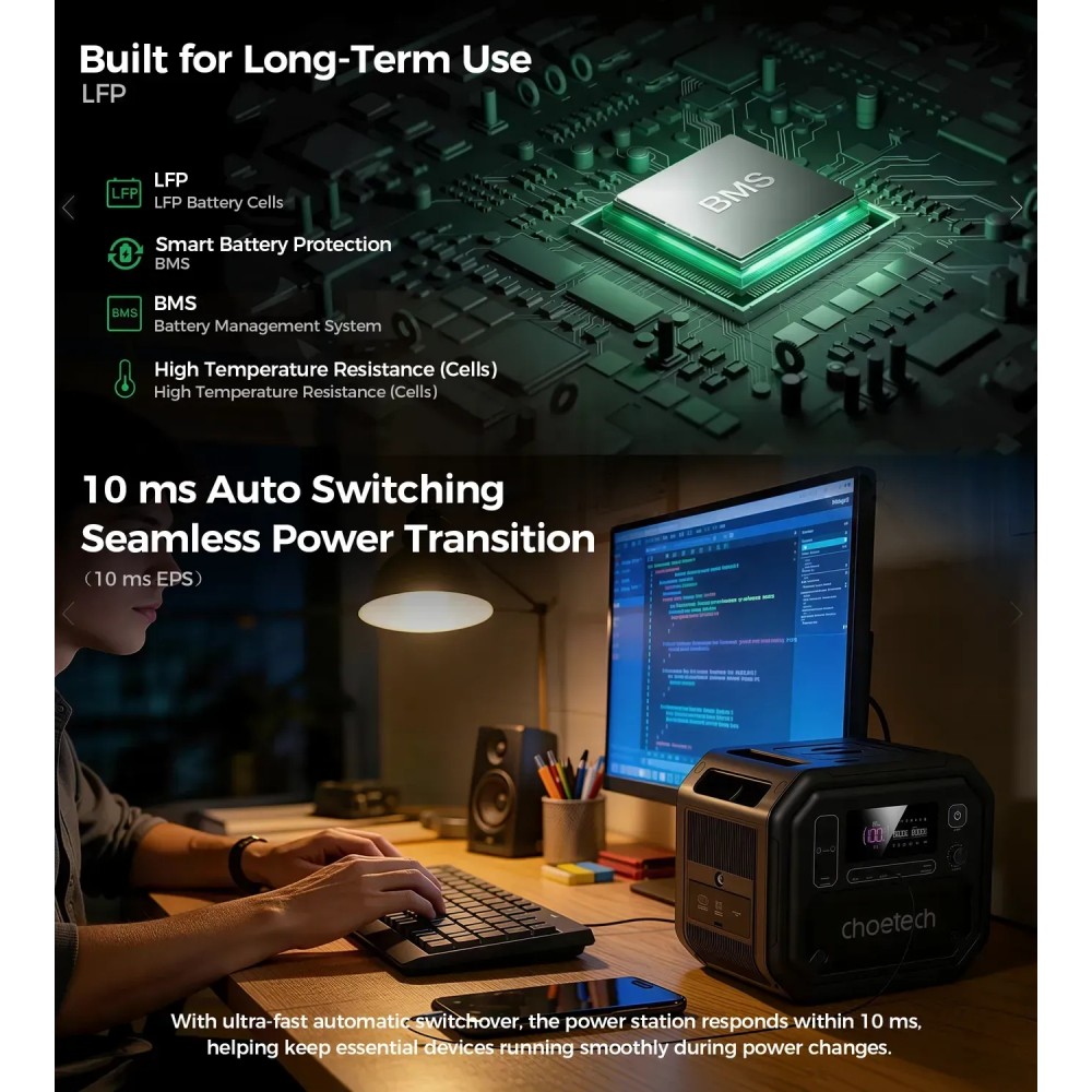 Choetech BS064 підтримує функцію ДБЖ, вона автоматично перемикається на живлення від батареї після відключення централізованого електропостачання впродовж 10 мс, тому чудово підходить для енергозахисту ваших комп’ютерів, маршрутизаторів, ігрових консолей та інших чутливих до перебоїв електропостачання приладів.