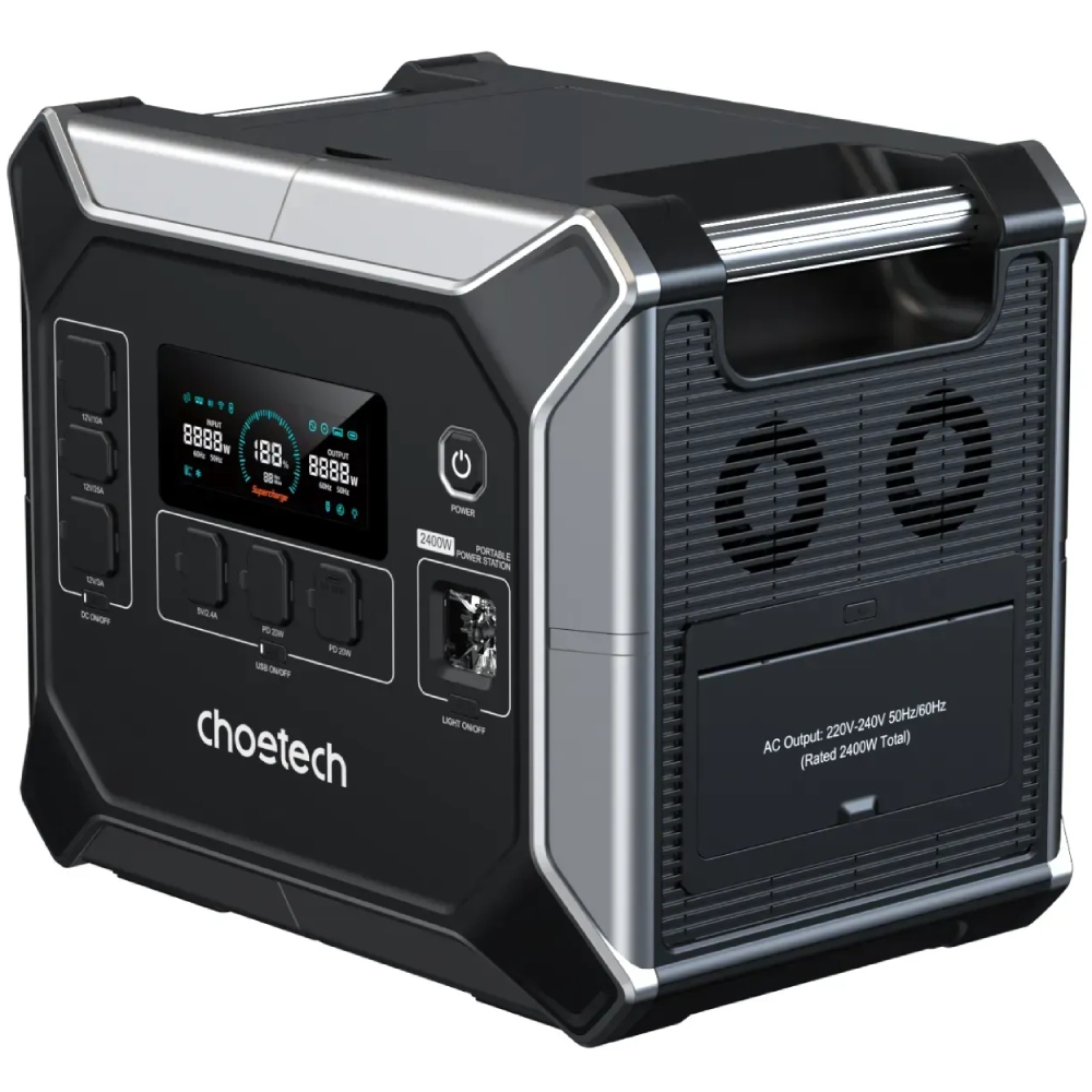 Портативна зарядна станція Choetech BS067 потужністю 2400 Вт призначена для безпечного та безперебійного живлення електрообладнання поза електромережею.