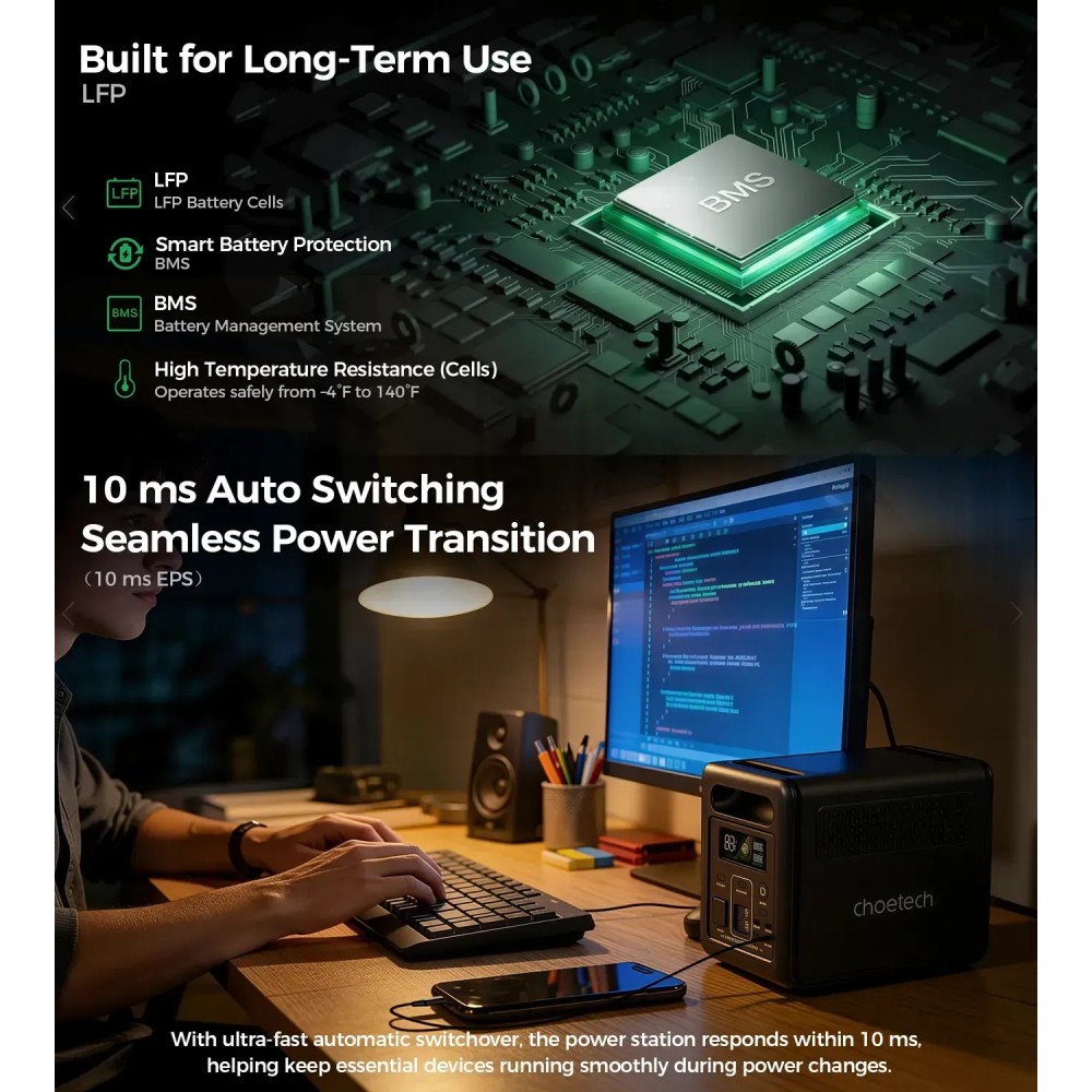 Choetech BS068 підтримує функцію ДБЖ, вона автоматично перемикається на живлення від батареї після відключення централізованого електропостачання впродовж 10 мс, тому чудово підходить для енергозахисту ваших комп’ютерів, маршрутизаторів, ігрових консолей та інших чутливих до перебоїв електропостачання приладів.