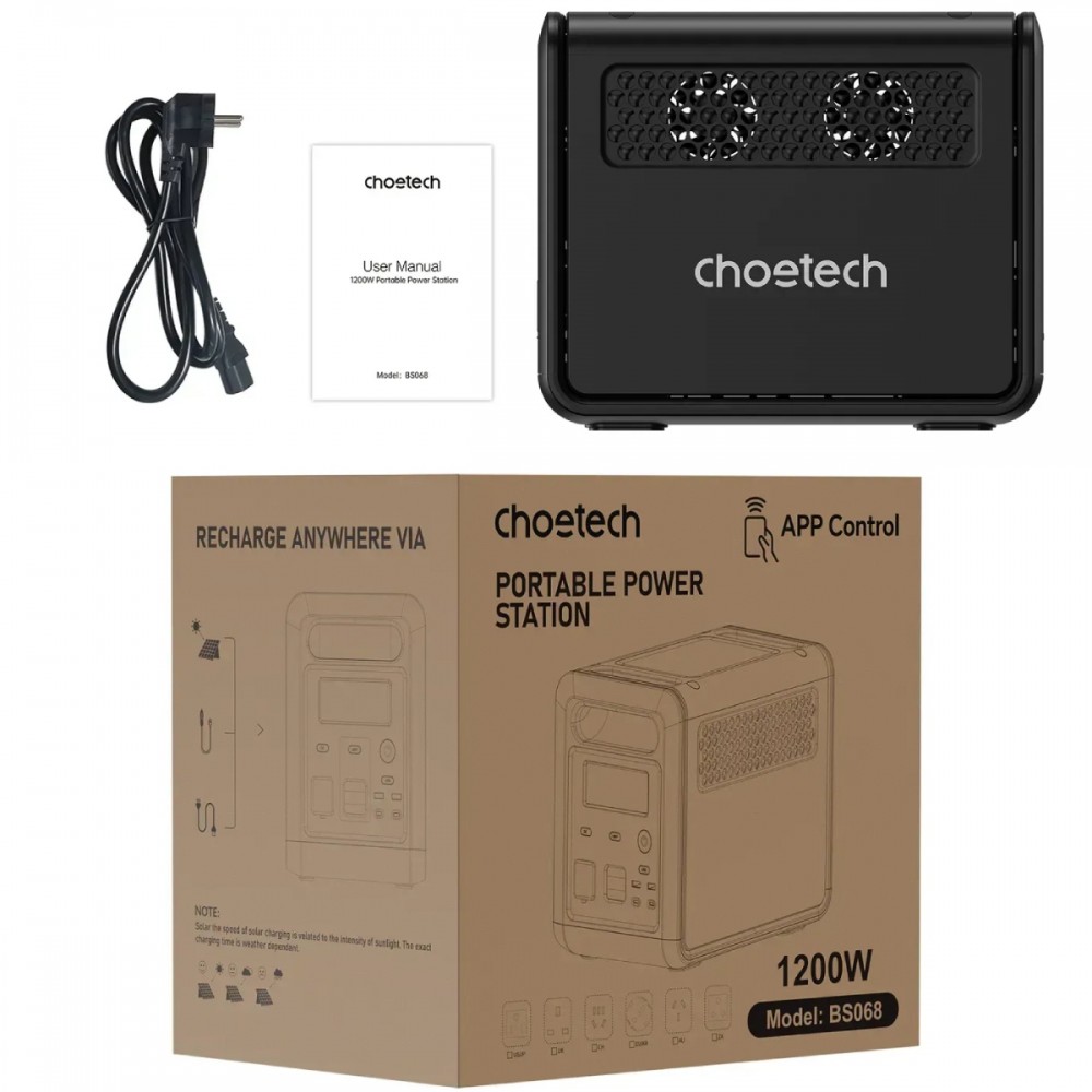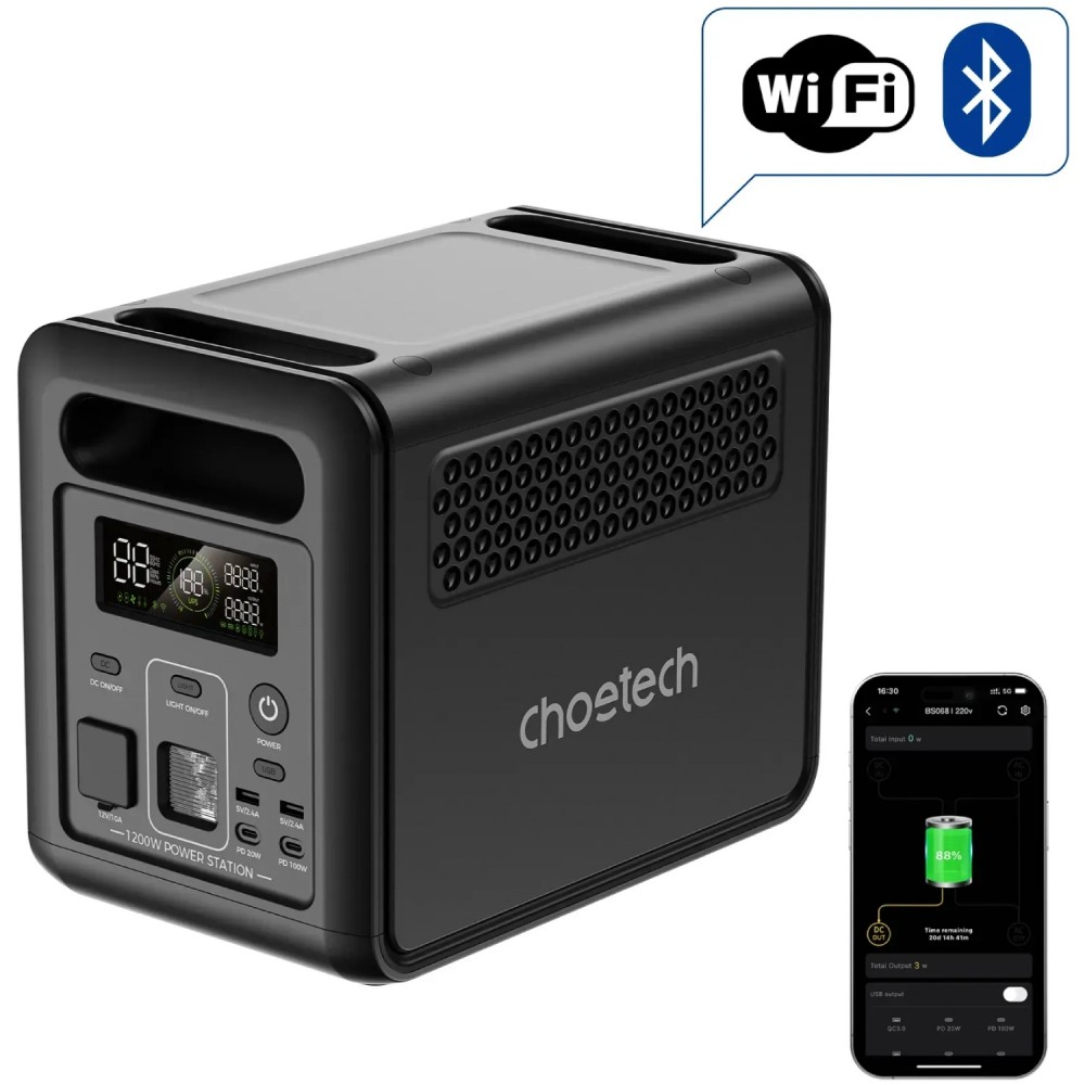 Портативна зарядна станція з чистою синусоїдою Choetech BS068 потужністю 1200 Вт призначена для безпечного та безперебійного живлення електрообладнання поза електромережею.