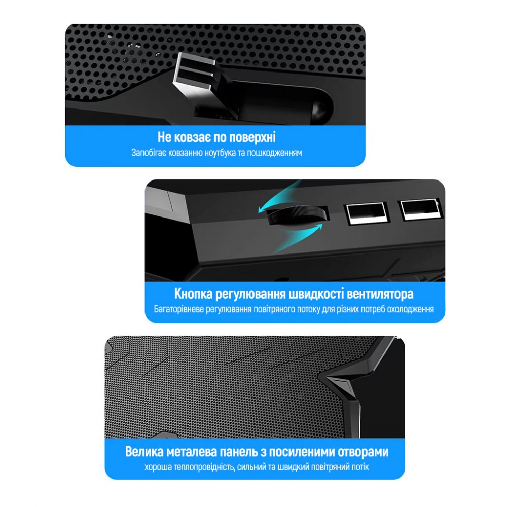 Розмір - 433 x 376 x 40 мм, Сумісність - для ноутбуків з діагоналлю екрану 12-17", Метод охолоджування - 4 вентилятори, активне, метал, пластик, 0.97 кг, Колір - чорний