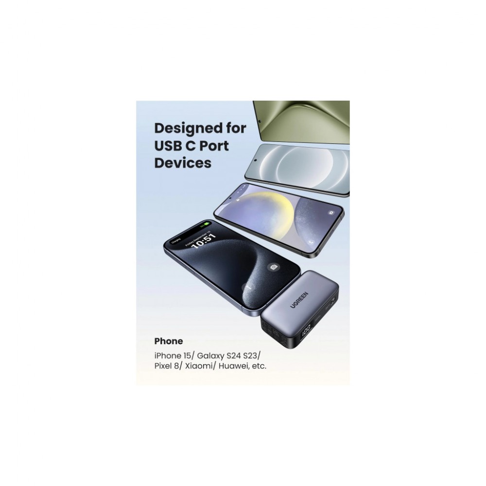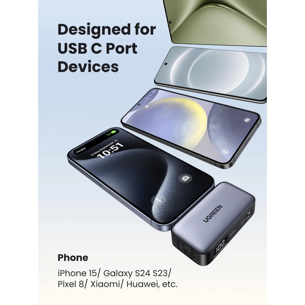 УМБ Ugreen 5000mAh 22,5W підтримує протоколи швидкого заряджання PD3.0/PD2.0, SCP/FCP, QC3.0/QC2.0, APPLE 5V2.4A, BC1.2. Для поповнення заряду iPhone 15 до 55% вам знадобиться лише 30 хвилин.