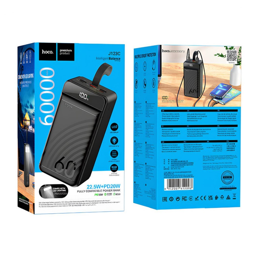 УМБ Hoco 60000mAh Element PD/20W, QC/22.5W, LED Lamp, Black (J123C / 714736)