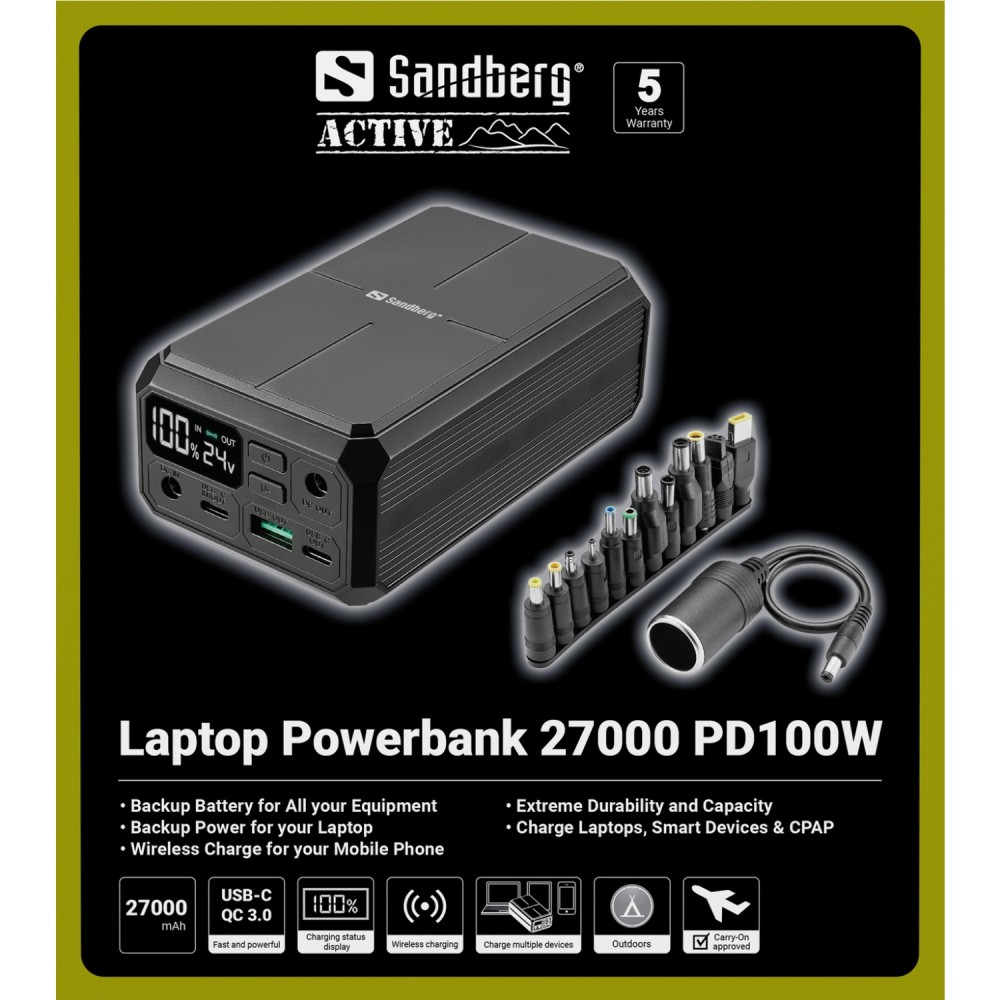 УМБ Sandberg 27000mAh Laptop DC12–24v 84W,100W PD, QC3.0, USB-A, 2xDC, 2xUSB-C, QI-10W, PowerThru