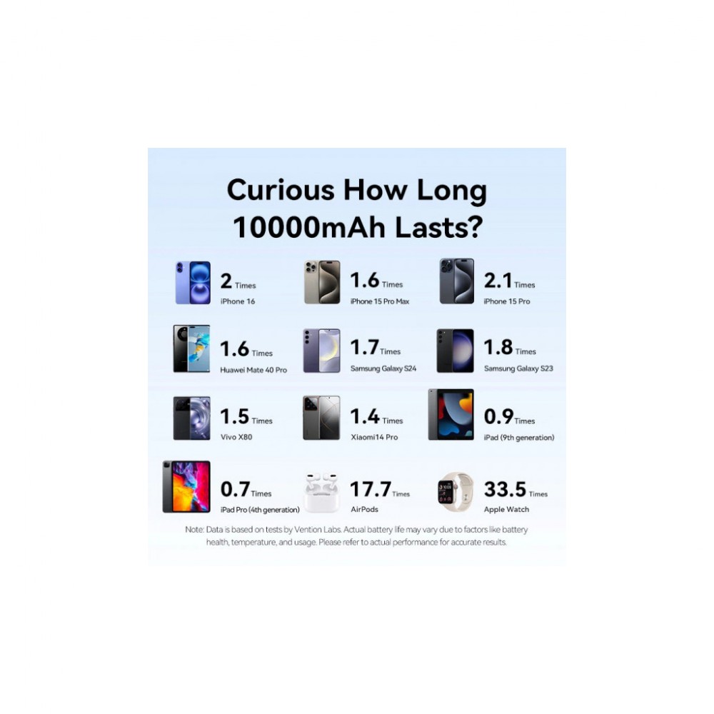 Компактний корпус та невелика вага батареї Vention 10000 mAh 22,5W PD роблять її зручною для користування, зберігання та перенесення. Беріть УМБ на борт літака, вона відповідає стандартним вимогам авіакомпаній до розміру або безпеки.
