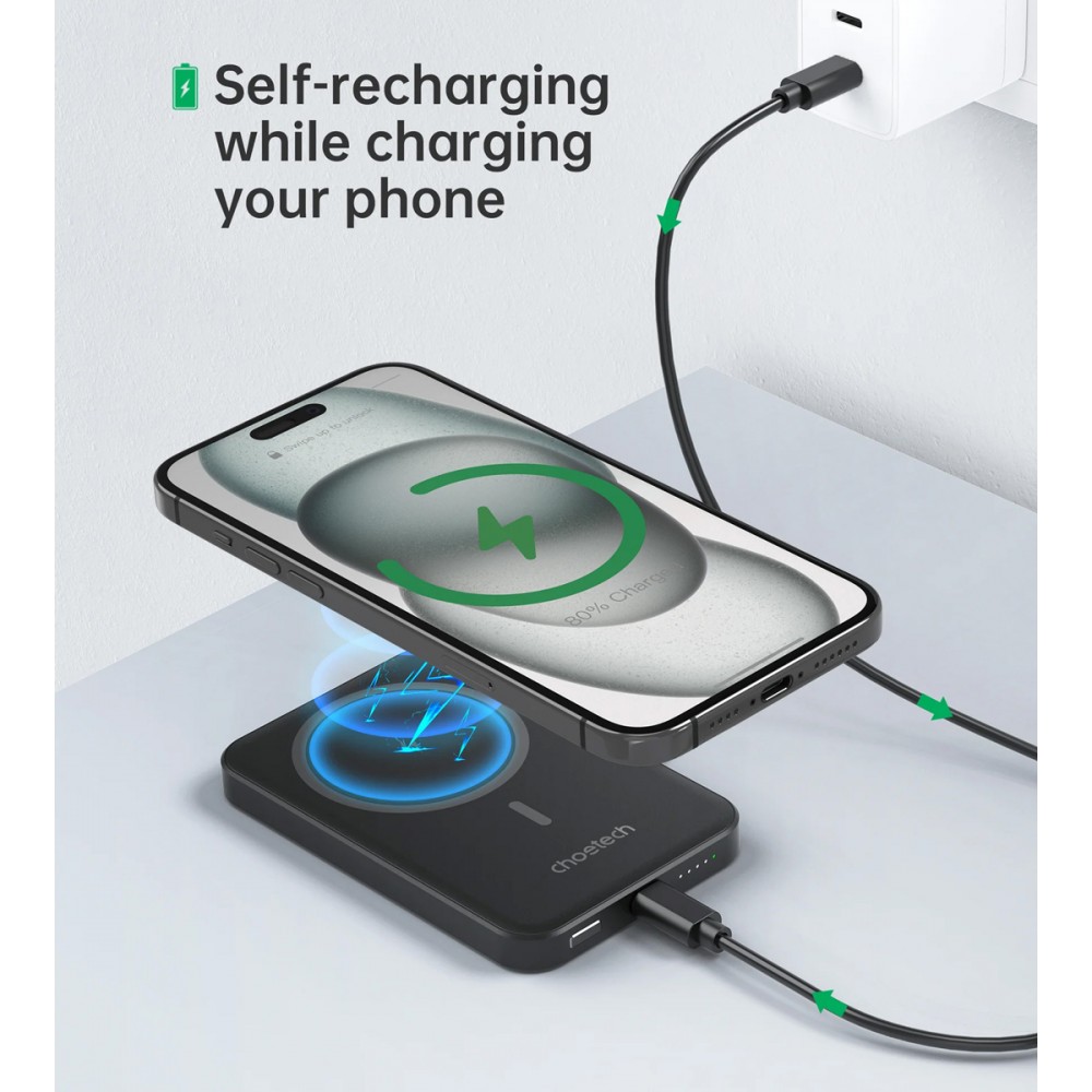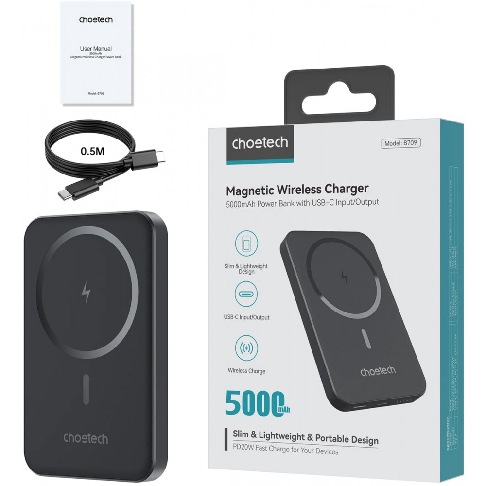 УМБ Choetech Magnetic Wireless 5000mAh 20W PD Qi-15W USB-C In/Out, тонкий, Black