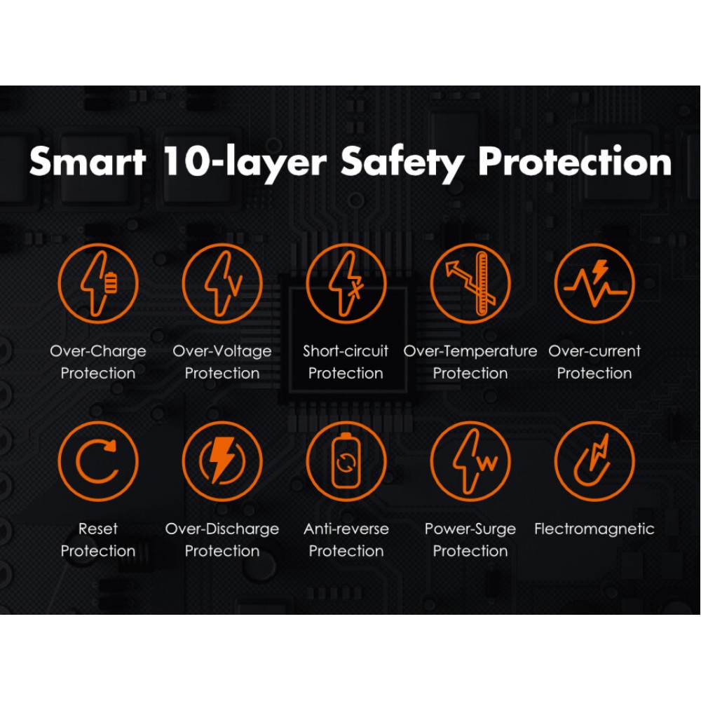 10-рівневий інтелектуальний захист захищає від перевантаження по силі струму, перезаряду, перегріву, перевантаження, різних перенапруг, коротких замикань та ін. Таким чином, Romoss 30000mah Sense8+ гарантує вам не тільки швидке, але й безпечне поповнення заряду.