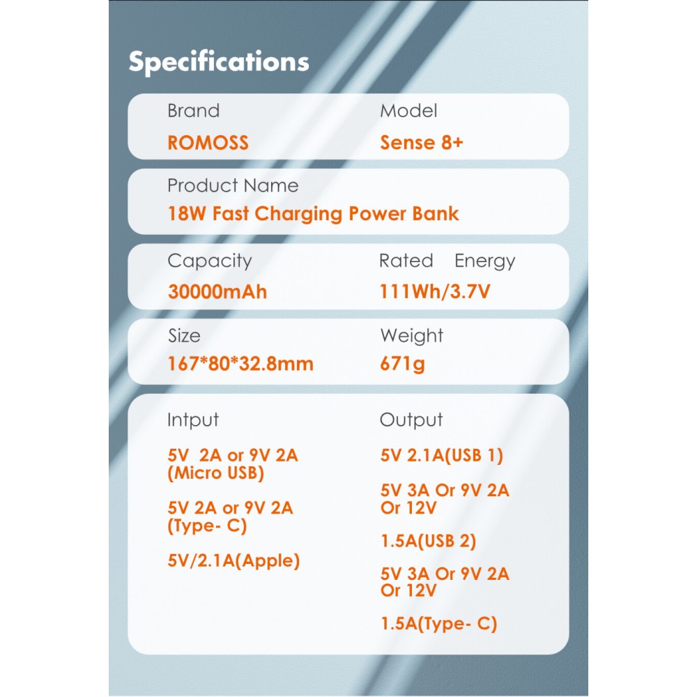 Стандарт швидкого заряджання QC 3.0, реалізований в акумуляторі, заряджає до 4 разів швидше в порівнянні зі звичайною зарядкою і на 12% швидше за стандарт QC 2.0. Технологія Power Delivery, яку також підтримує Romoss 30000mah Sense8+, рекомендована Apple для швидкого заряджання смартфонів починаючи з iPhone 8 і закінчуючи пізнішими моделями. Слід врахувати, що при одночасному зарядженні кількох пристроїв технологія швидкого заряджання не працює, і підзарядка відбувається зі звичайною швидкістю.