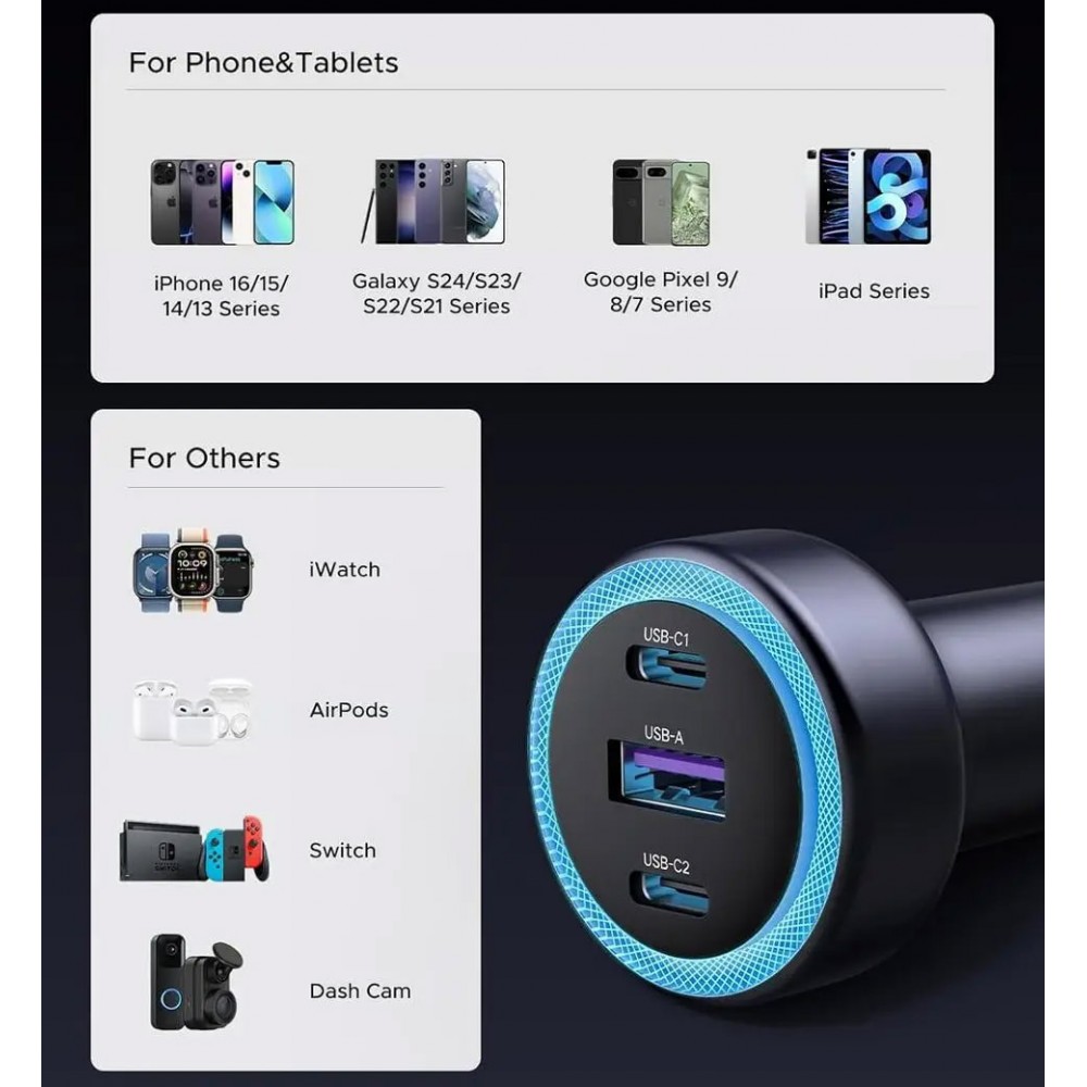 Автозарядка 3xUSB 30W (2xUSB-C + USB-A) QC 4.0 Сіра (EC307) UGREEN