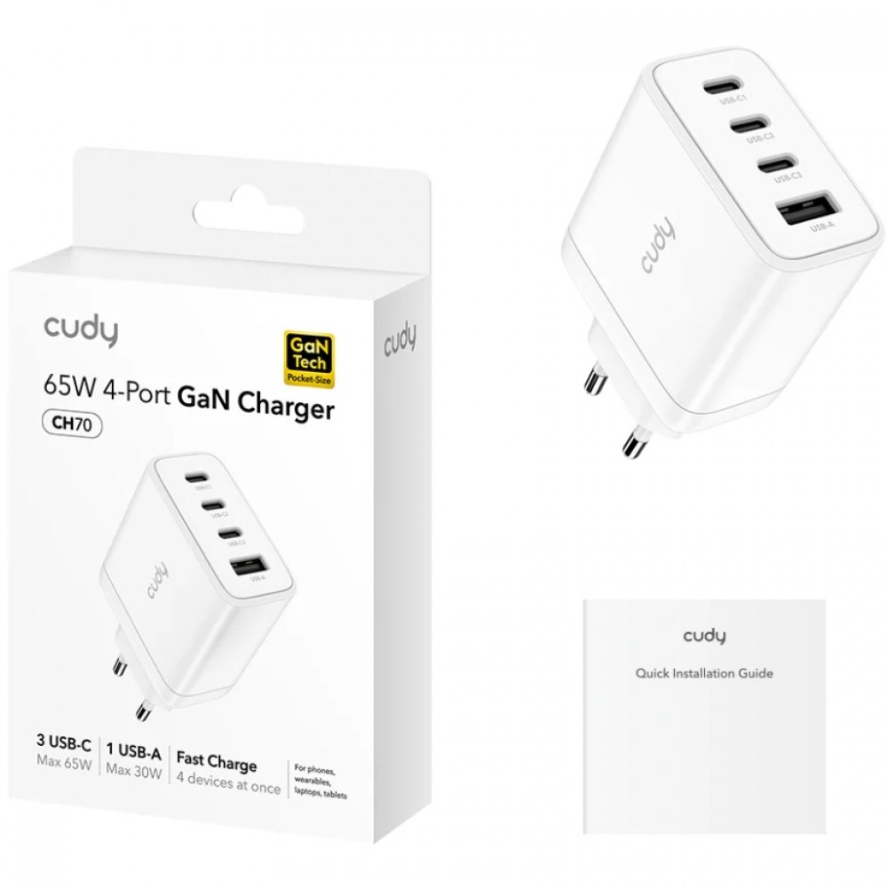Зарядний пристрій 4xUSB 70W, (4-Port 65W USB-C Charger with EU Plug, GaN, 3 x USB-C (65W max),1 x USB-A (30W max ),QC+PPS+PD 3.0, EU plug, Fast charge for iPhone 12 Series and above, Galaxy, iPad, Macbook and more ), Cudy