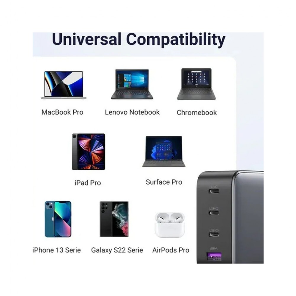 Він забезпечує швидку зарядку практично всіх телефонів, планшетів, ноутбуків та інших USB-A і USB-C пристроїв, включаючи MacBook Pro, MacBook Air 2020 і 15-/13-дюймовий Dell XPS.