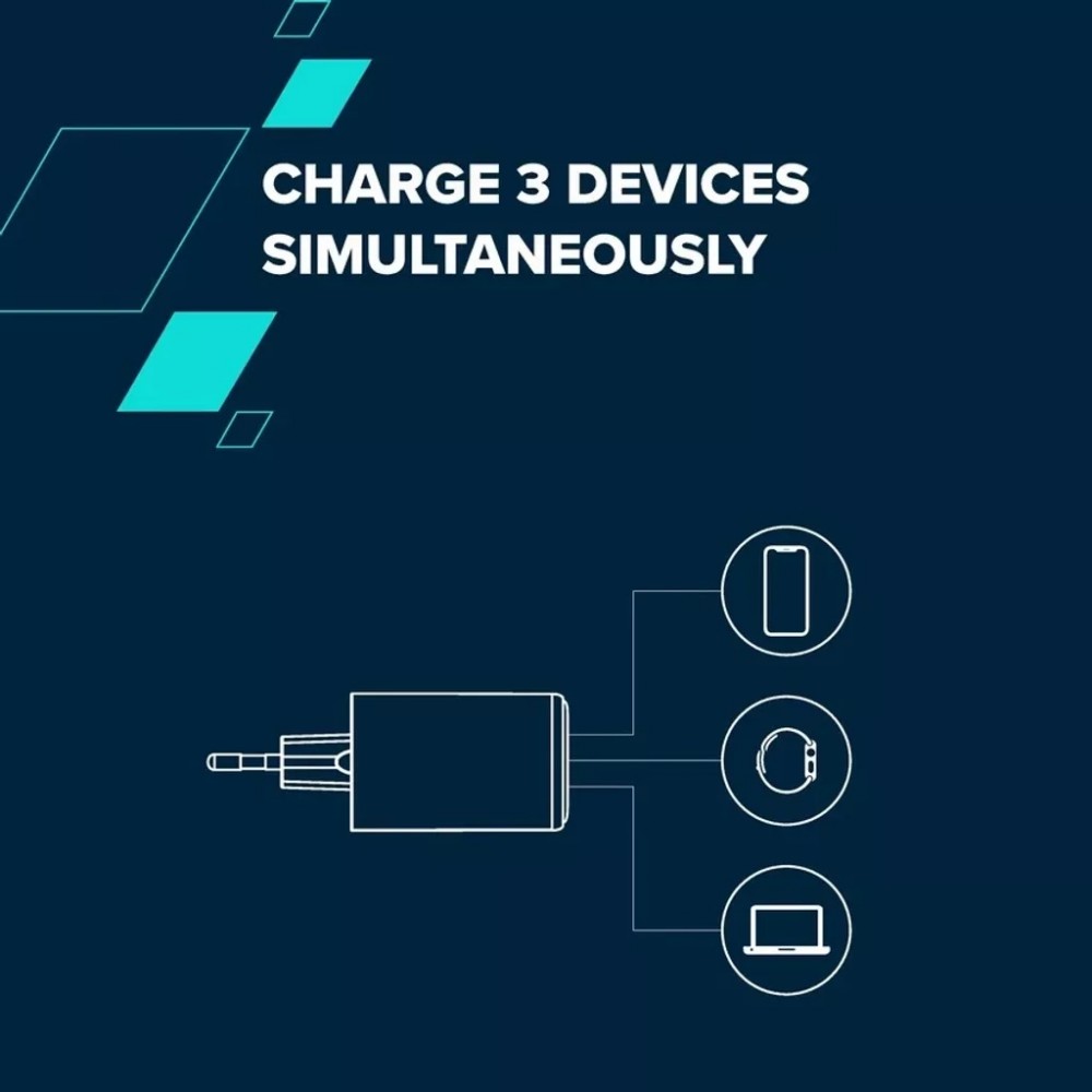 Тип - адаптер, Живлення - мережа, Призначення - для планшета, для фітнес-браслета, для смарт годинника, для ноутбука, для смартфона, тип вихідного підключення - USB Type-C, USB, Max - 3 А, 65 Вт, кількість USB портів - 1 x USB, 2 x USB Type C, швидка зарядка - Power Delivery, Quick Charge 4.0, білий