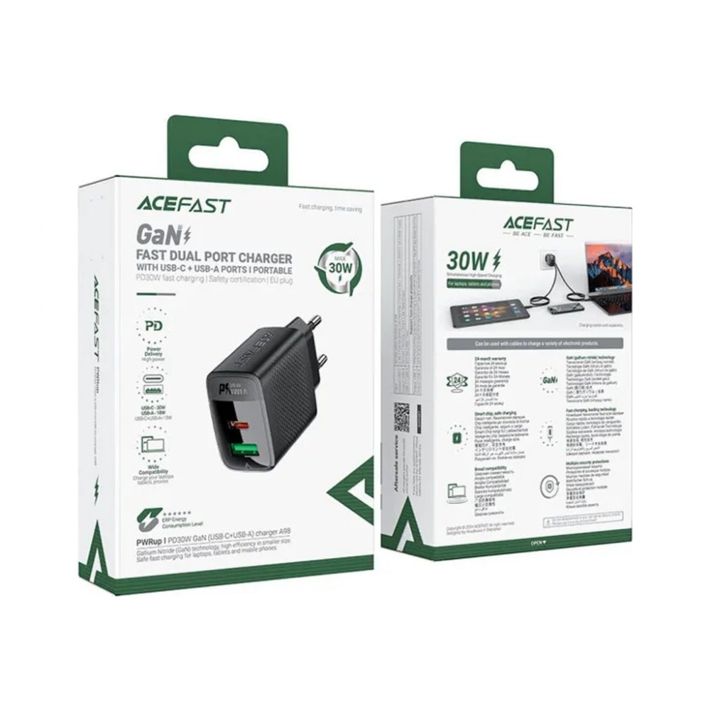 Зарядний пристрій 2xUSB 30W (USB-C+USB-A) Gan A98 Black Acefast (6974316283263)