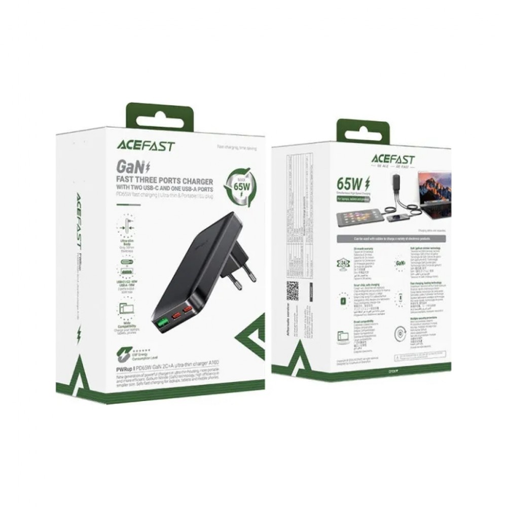 Зарядний пристрій 3xUSB 65W (2xUSB-C+USB-A) Gan A100 Fast Charger Ultra thin black Acefast (6974316283492)