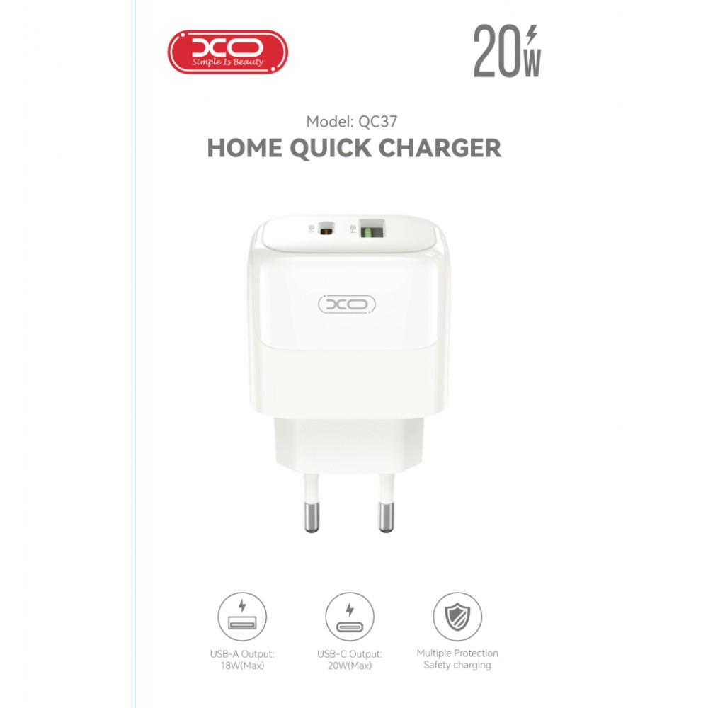 Зарядний пристрій XO 1xUSB QC3.0 + 1xUSB-C PD20W (XO-QC37)