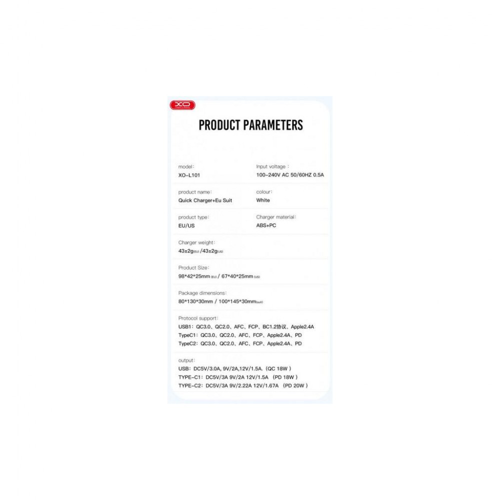 Зарядний пристрій XO L101 PD + QC3.0 (1USB/2Type-C/20W) + USB - MicroUSB White (XO-L101-WH)