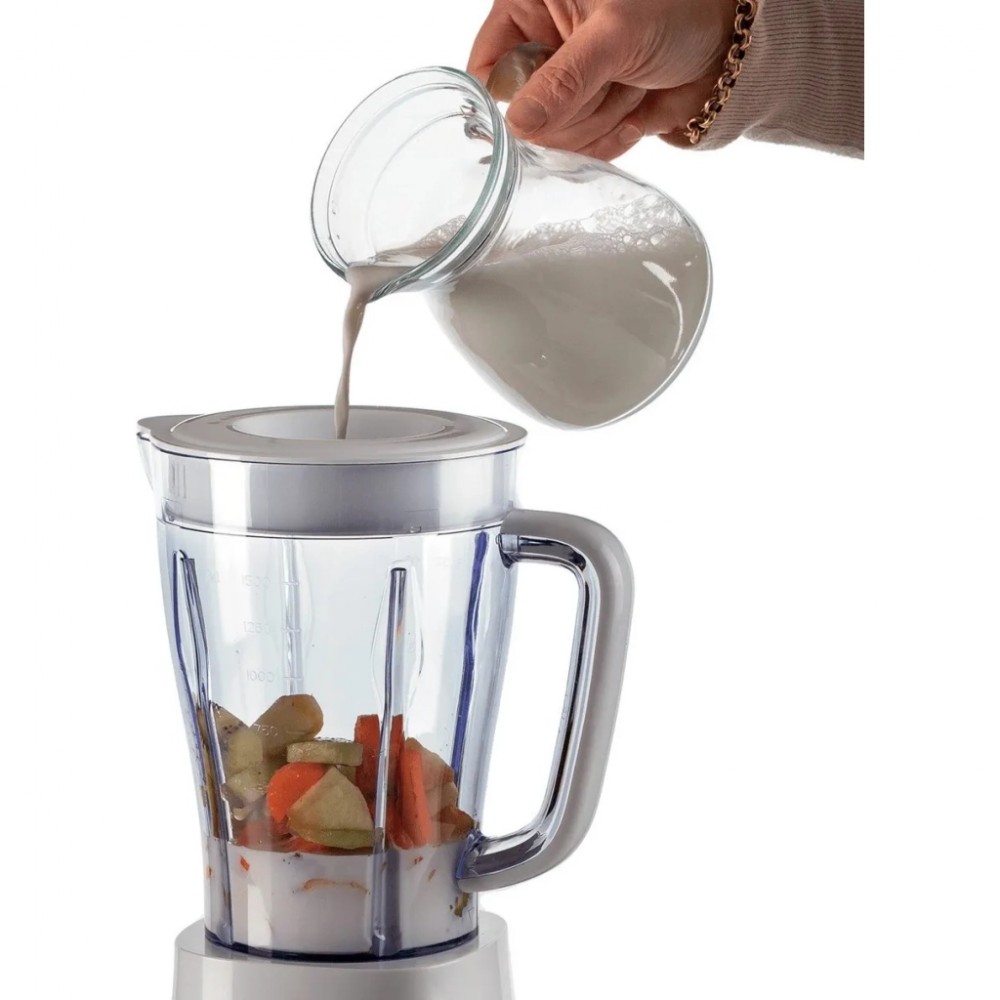 Блендер має ємність мірної склянки 1.5 літра, що дозволяє зручно приготувати достатню кількість суміші для родини або гостей. На додачу він оснащений знімним ножем-подрібнювачем, який полегшує процес очищення та догляд за приладом.