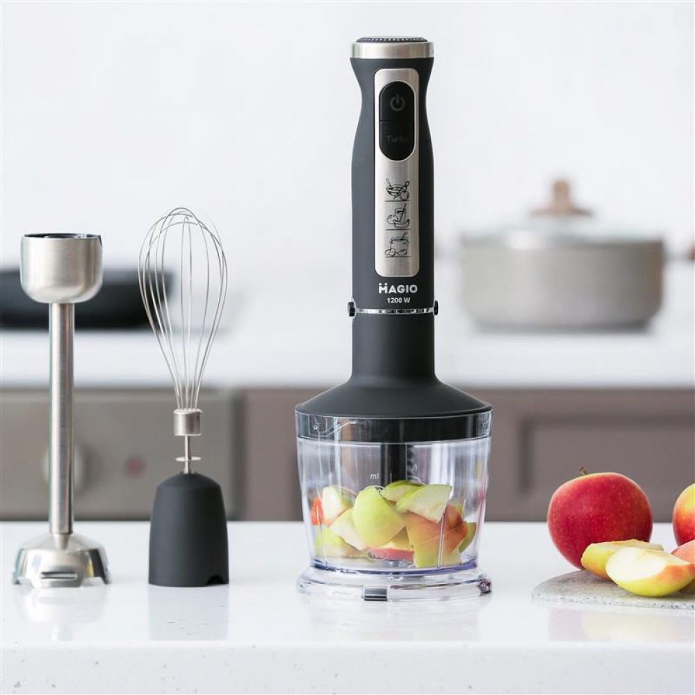 Блендерний набір MG-644 дасть вам змогу урізноманітнити ваше меню і приготувати новий кулінарний шедевр. Потужність блендера становить 1200 Вт, що забезпечує безшумну ефективну роботу впродовж тривалого часу. Заглибна частина та ніж зроблені з неіржавкої сталі — запорука стійкості до зношування й довговічності. Ергономічна ручка з приємним покриттям SOFT TOUCH.