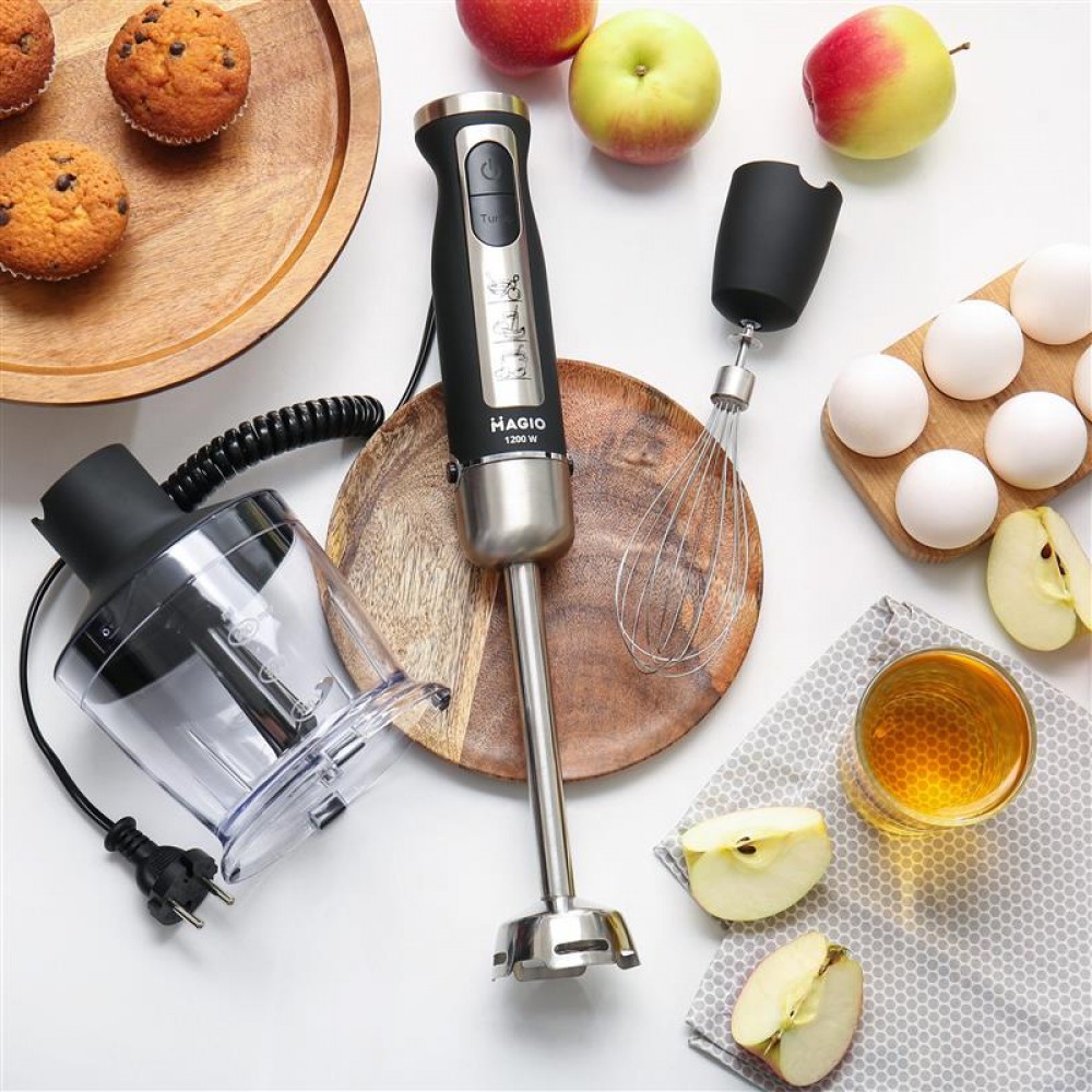 Блендер може працювати на 19 швидкостях, що плавно перемикаються. Перемикач міститься на ручці приладу, що дуже зручно. У комплект входить вінчик для збивання й мініподрібнювач об'ємом 500 мл. Ці властивості в поєднанні з компактним дизайном роблять блендер незамінним помічником на вашій кухні.