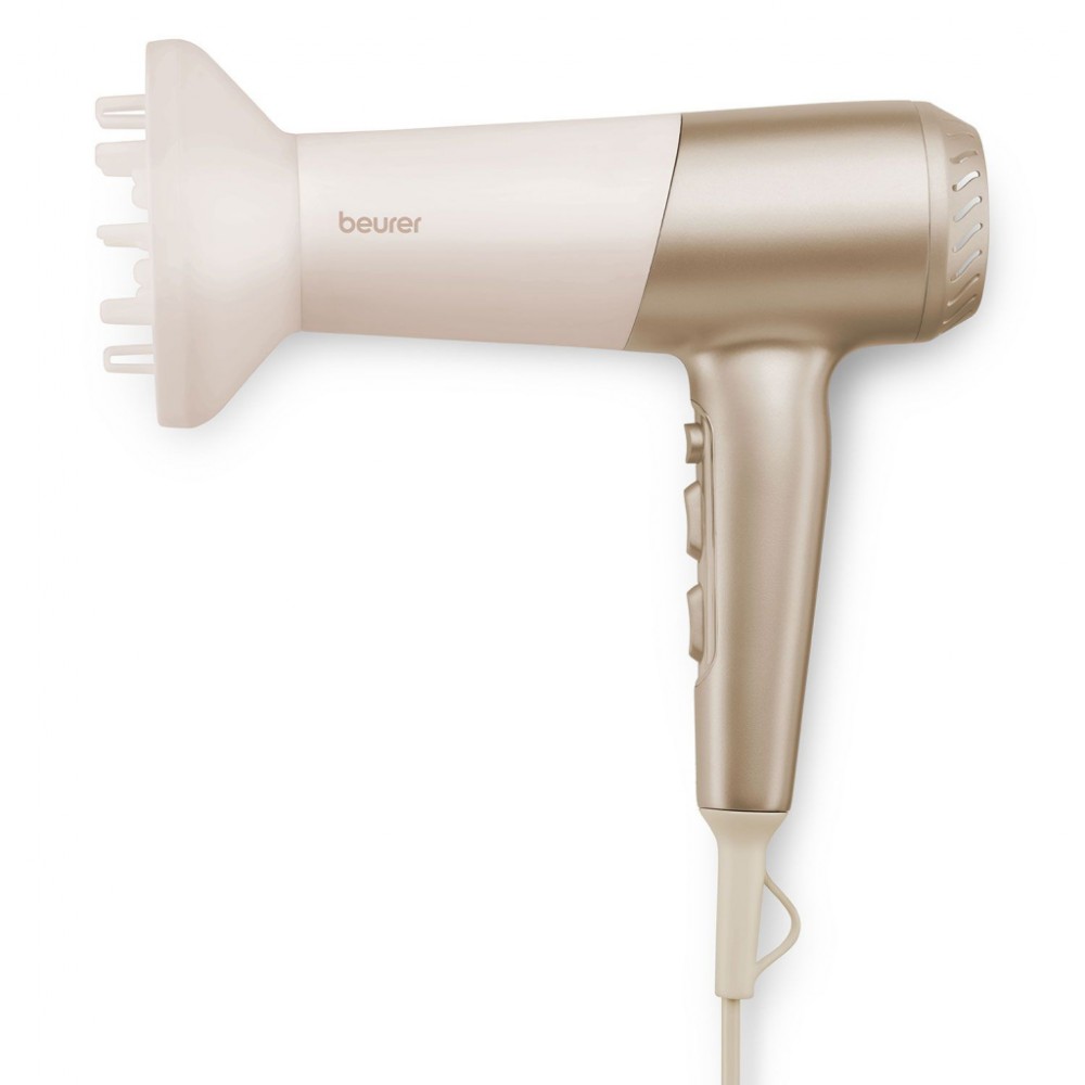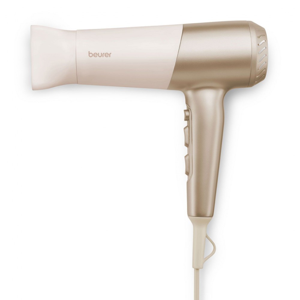 Фен Beurer HC 70 – це ідеальний інструмент для тих, хто прагне поєднати естетику, ефективність та турботу про волосся. Належачи до преміальної серії HairCare, цей фен вирізняється елегантним бежево-золотим дизайном, який стане чудовим доповненням до вашої домашньої колекції приладів для догляду за собою. Завдяки своїй легкій вазі у 0,7 кг і ергономічній конструкції, Beurer HC 70 забезпечує зручність і легкість у використанні, дозволяючи неперевершено створювати укладки без втоми.