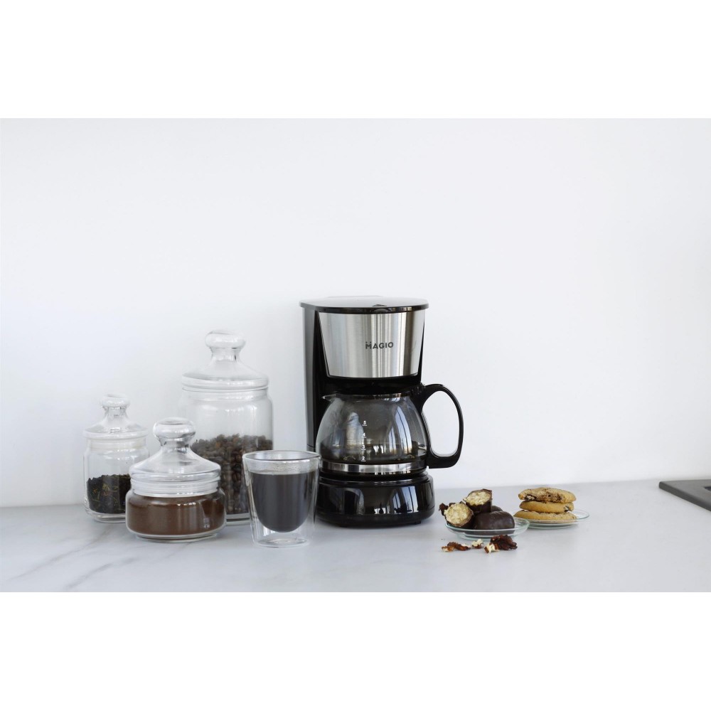 Кавоварка MG-964 розроблена для справжніх поціновувачів кави. Потужність кавоварки становить 650 Вт, тобто кава готується досить швидко, зберігаючи в неї смак і аромат. У ній в чудовий спосіб поєднуються стиль і практичність. Гладкий корпус у класичному чорному кольорі ідеально підходить до будь-якої робочої поверхні. Кавоварка готує каву безпосередньо в кавник із міцного прозорого скла, який постачають у комплекті з приладом.