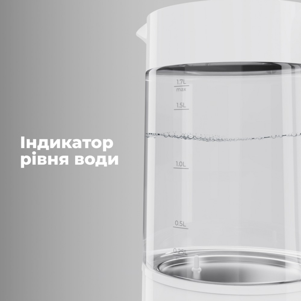 Тип - звичайний, об'єм - 1.7 л, 1850 Вт, матеріал корпусу - пластик, скло, Фільтр від накипу - незнімний, Кришка - незнімна