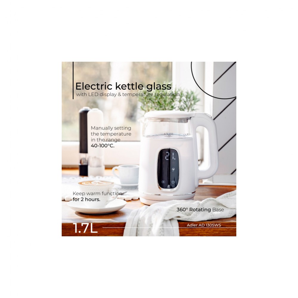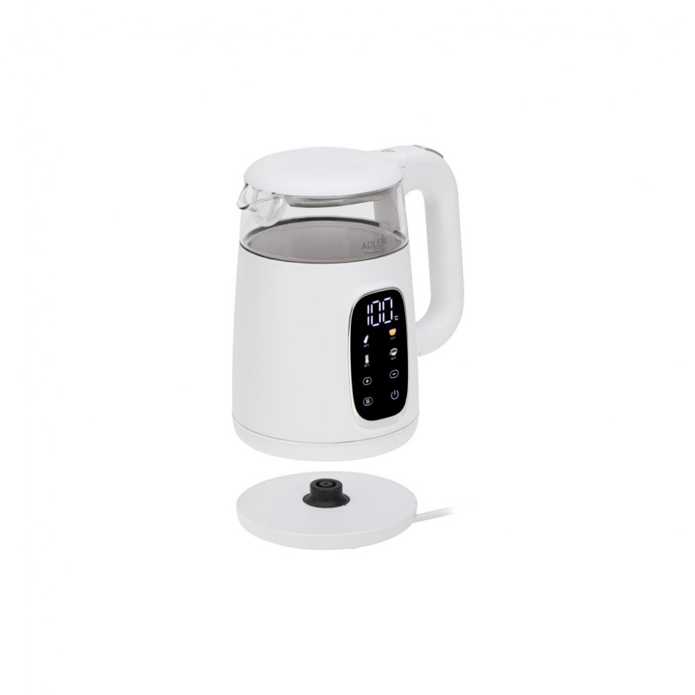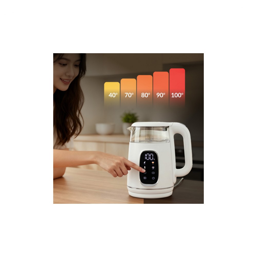 Чайник Adler AD 1305 - багатофункціональний чайник потужністю 1850-2200 Вт та об’ємом 1,7 л. Він підтримує п'ять попередньо встановлених температурних налаштувань температури (40-70-80-90-100 °C), ручне регулювання температури та підтримку тепла в діапазоні 40-100 °C впродовж 2 годин.