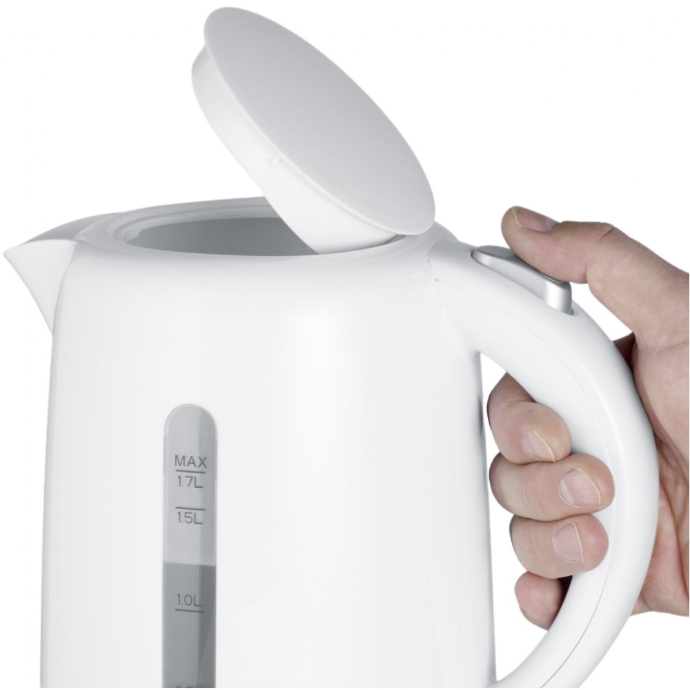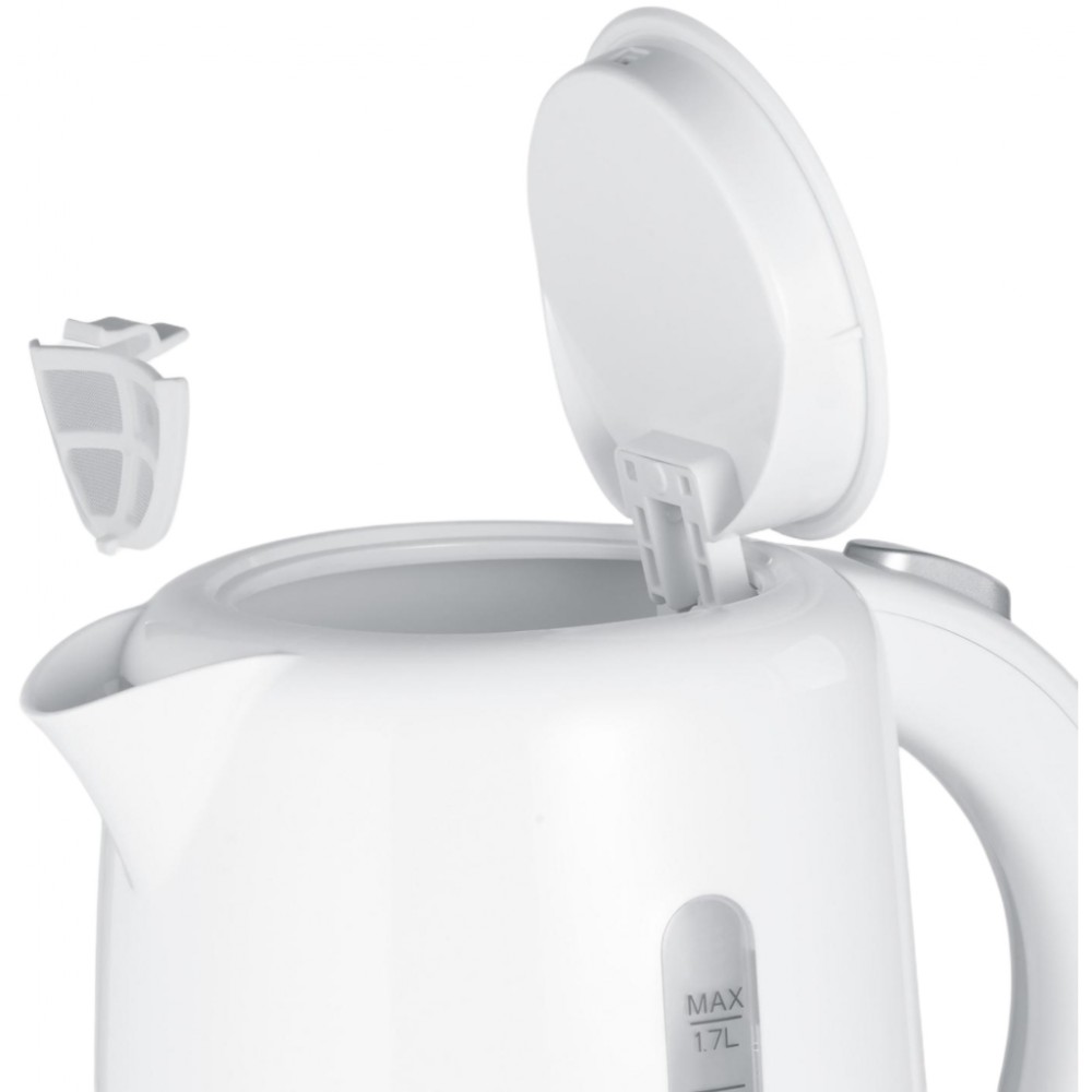 Тип - звичайний, об'єм - 1.7 л, 2200 Вт, матеріал корпусу - пластик, Фільтр від накипу - зйомний, Кришка - незнімна, білий