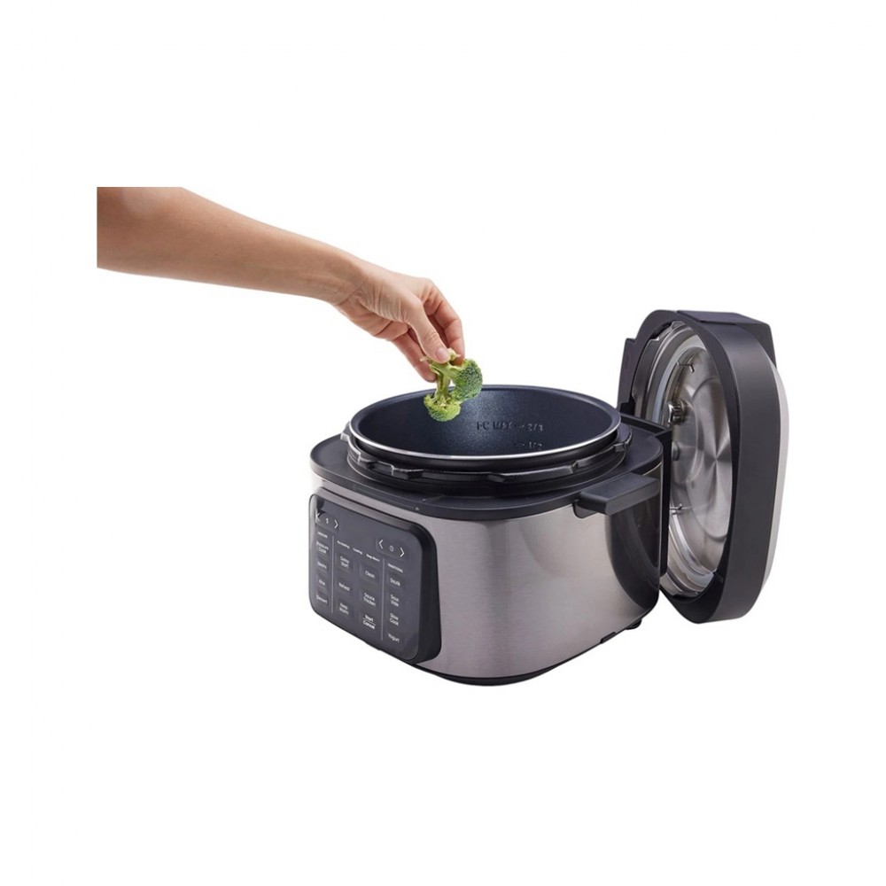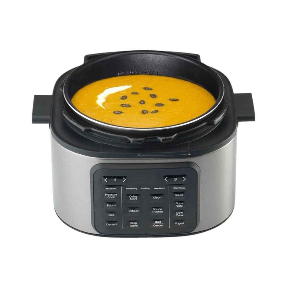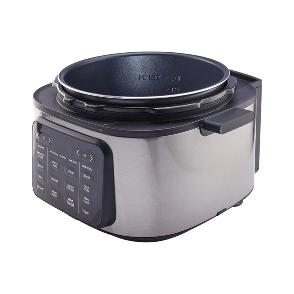 мультиварка - скороварка, 1500 Вт, об'єм чаші - 6 л, тип внутрішнього покриття - антипригарне, алюміній, кількість програм - 10, Керування - сенсорне, габарити - 36 х 36.6 х 30 см, вага - 7.2 кг, чорний, нержавіюча сталь