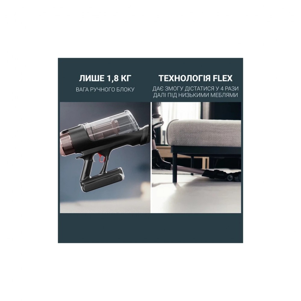 Тонкий, компактний і легкий дизайн — лише 1.8 кг у ручному режимі — у поєднанні з технологією Flex дозволяє прибирати в 4 рази далі та нижче, не згинаючись.