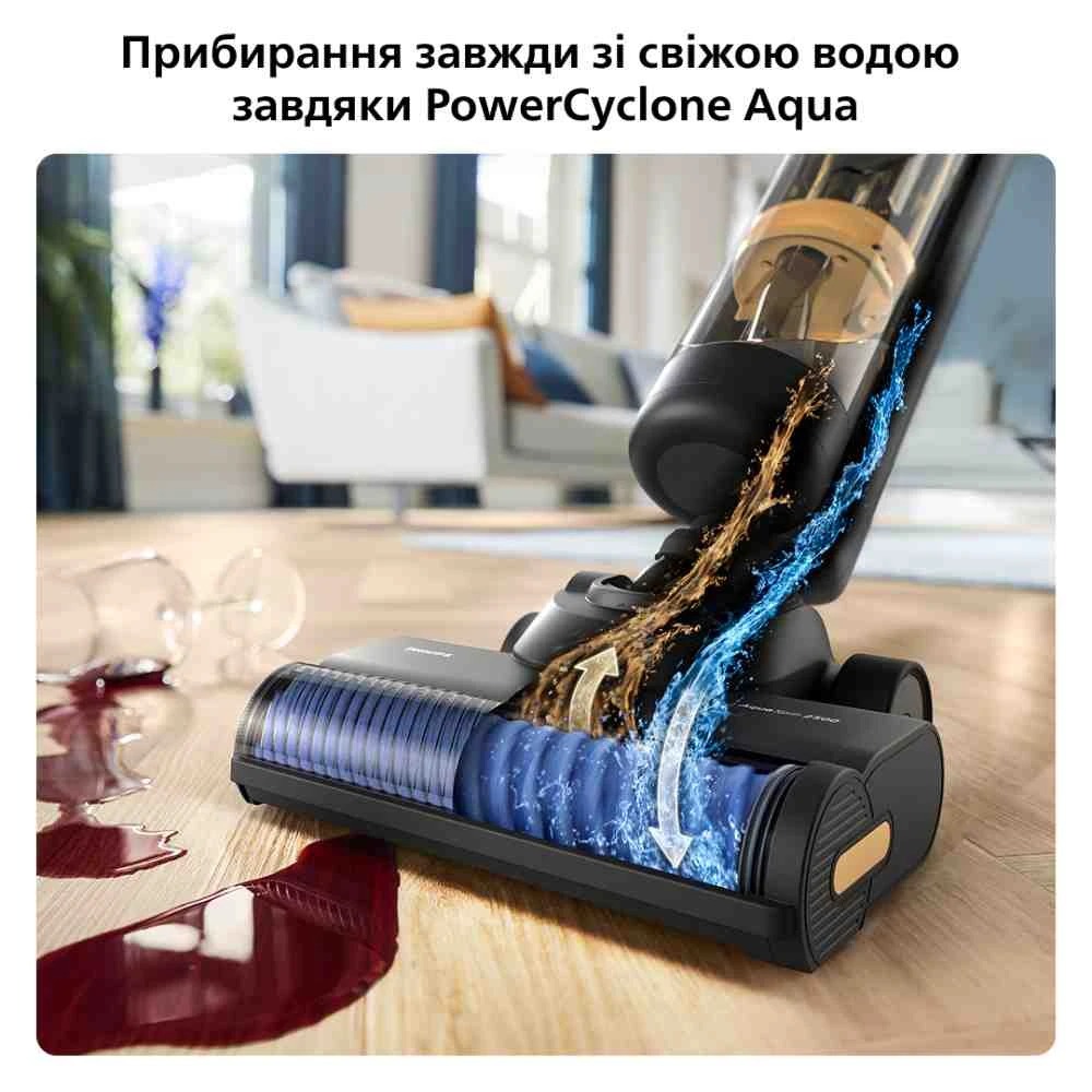 PowerCyclone Aqua ефективно відокремлює й затримує бруд і брудну воду, забезпечуючи постійний потік свіжої води, що проходить через щітки й на підлогу.