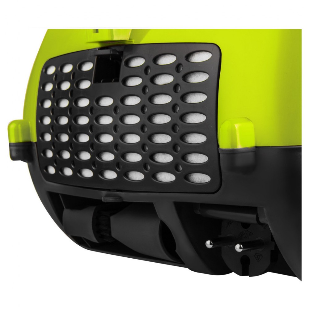 Виконаний в обтічному корпусі з міцного пластику і оснащений широкими прогумованими колесами, він швидко маневрує під час роботи, огинаючи крісла і торці меблевого гарнітура. Широка рукоятка буде зручною при перенесенні пилососа між кімнатами. Базовий комплект насадок включає універсальну підлога / килим і комбіновану щелевую насадку з густою щіткою. Остання буде корисною для прибирання важкодоступних місць і м'яких меблів.
