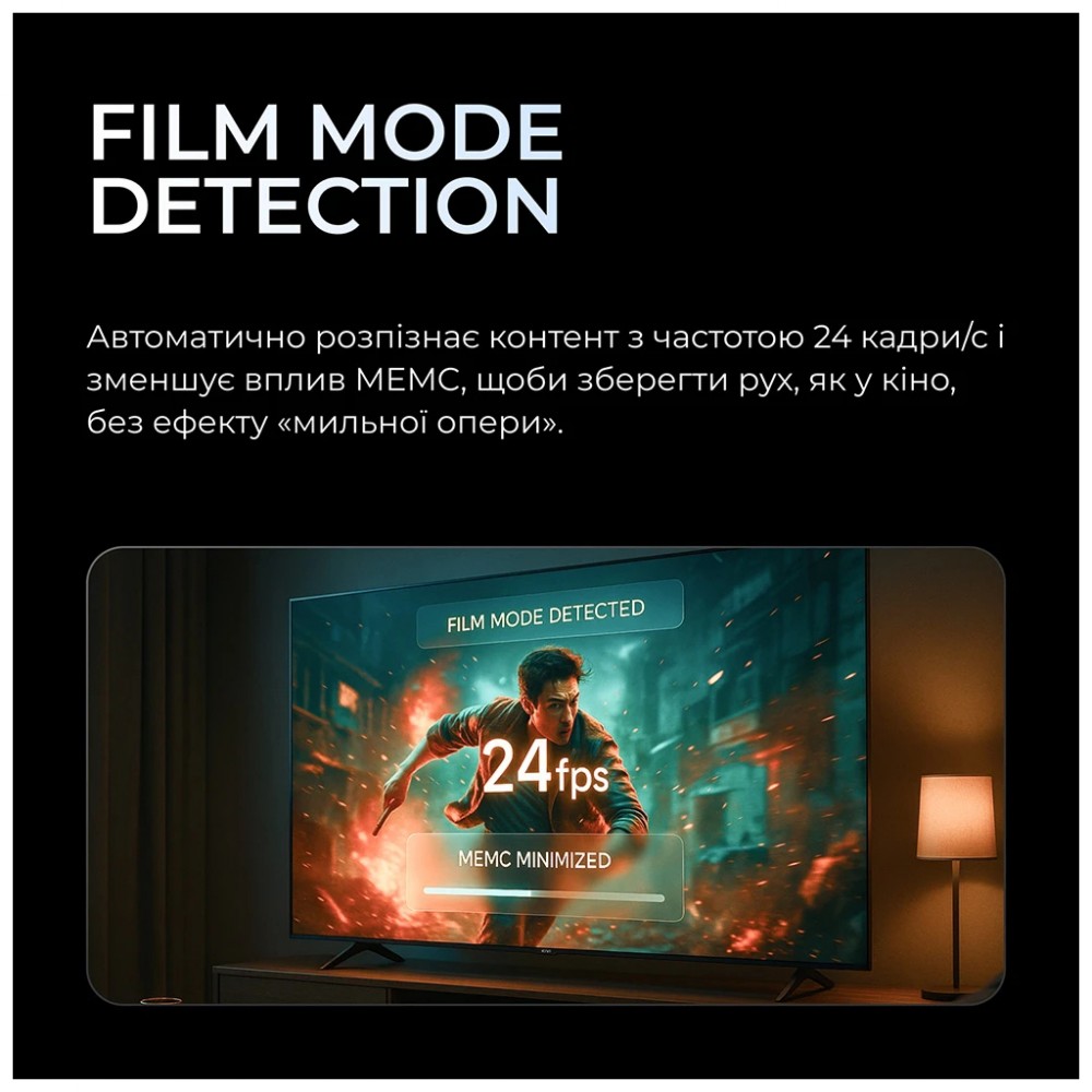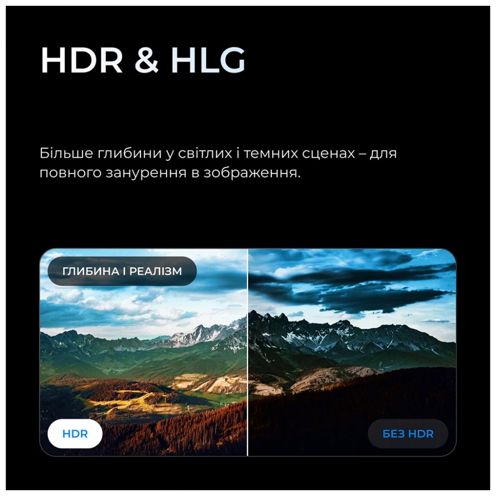 Широкий кут огляду 178°/178° та контрастність 1700:1 гарантують стабільну якість зображення незалежно від позиції глядача. Підтримка технологій Dolby Vision, HDR, HLG і 4K Upscaling забезпечує глибші тіні, яскравіші відтінки та покращену деталізацію навіть у контенті з нижчою роздільною здатністю.
