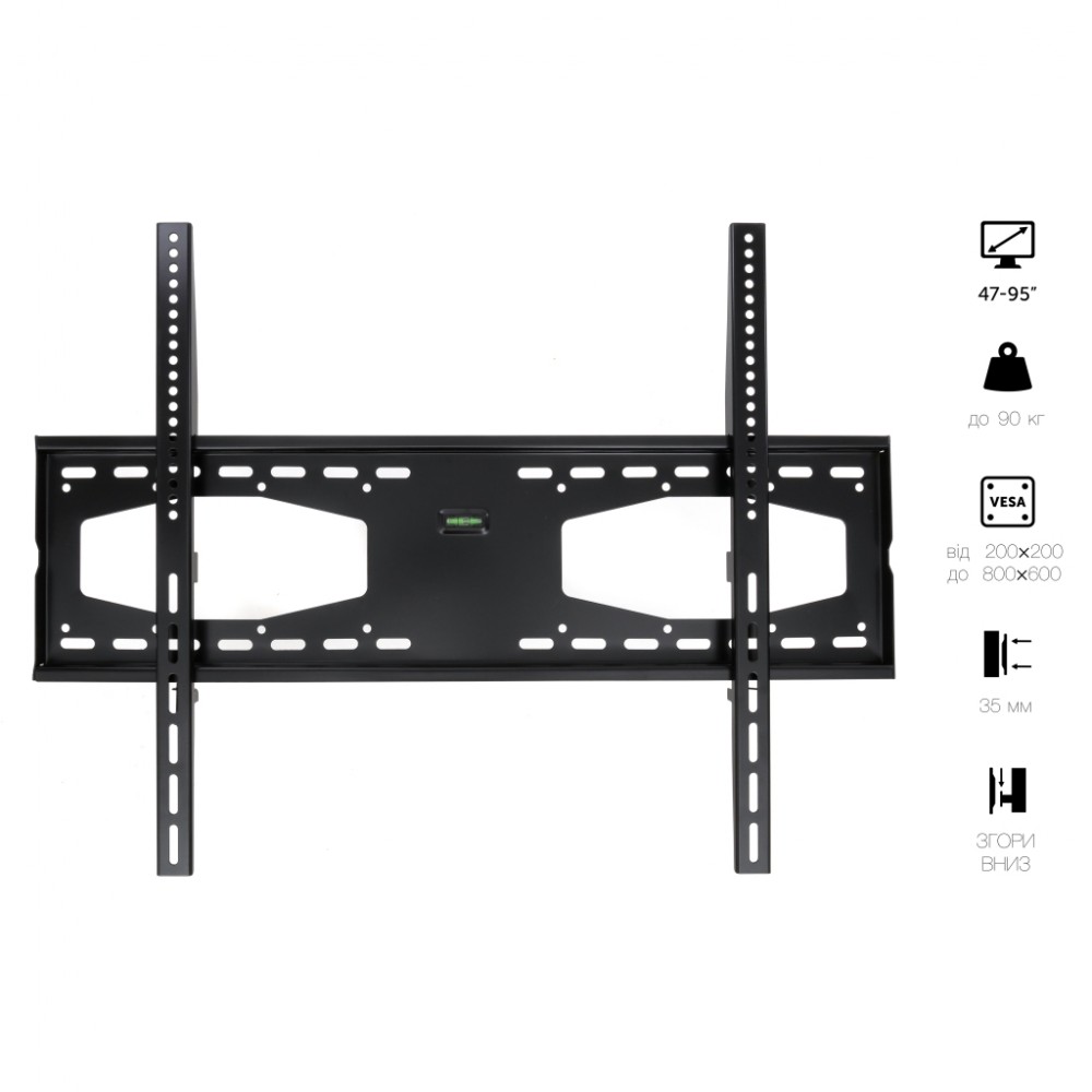 для телевізора, Тип - фіксований, кількість ступенів свободи - 0, мінімальна підтримувана діагональ - 47", максимальна підтримувана діагональ - 90", VESA - 200 x 200, 200 x 300, 300 x 200, 200 x 400, 300 x 300, 400 x 200, 400 x 300, 400 x 400, 400 x 600, 400 x 800, 400 x 900, 500 x 400, 600 x 200, 600 x 300, 600 x 400, 600 x 500, 600 x 590, 600 x 600, 700 x 400, 700 x 450, 800 x 500, 800 x 600, 300 x 400, 300 x 500, 400 x 100, 400 x 500, 500 x 200, 500 x 300, 500 x 500, 500 x 600, 700 x 500, 700 x 200, 700 x 300, 700 x 600, Максимальне навантаження - 90 кг, відстань до стіни - 35мм, з бульбашковим рівнем, вага - 4.14 кг, чорний