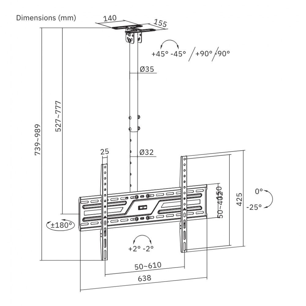 - Кут нахилу: 0°~-25°