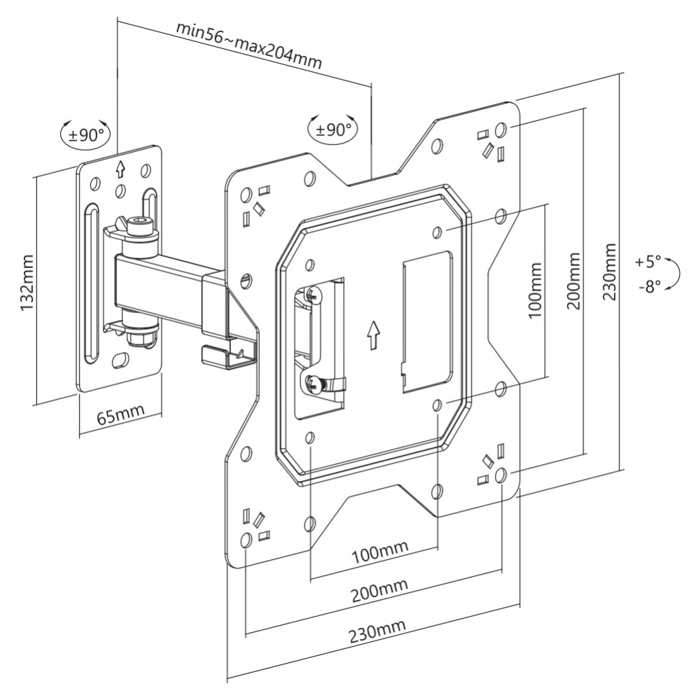 для телевізора, Тип - поворотно-похилий, кількість ступенів свободи - 2, мінімальна підтримувана діагональ - 23", максимальна підтримувана діагональ - 43", VESA - 100 x 200, 100 x 100, 200 x 100, 200 x 200, Максимальне навантаження - 30 кг, Нахил - 5° ~ -15°, -8º ~ +5º, Поворот - +90° ~ −90°, відстань до стіни - 56 - 204 мм, кронштейн, інструкція, монтажний комплект