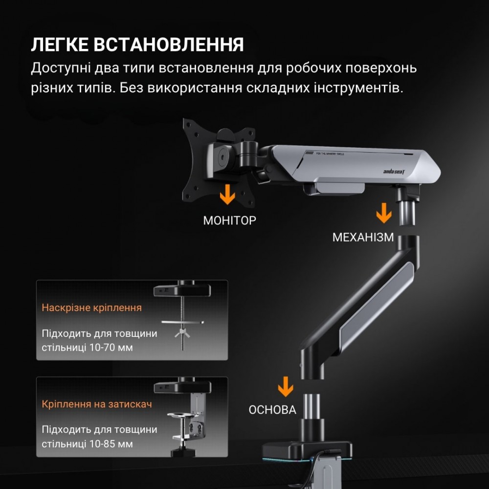 Кронштейн виготовлений із міцних матеріалів і здатний витримувати вагу до 15 кг, що гарантує стабільність навіть для важких моніторів. Завдяки надійній конструкції, Anda Seat AD-W-A9X-1S-BS забезпечує безпеку вашого обладнання та довговічність використання.