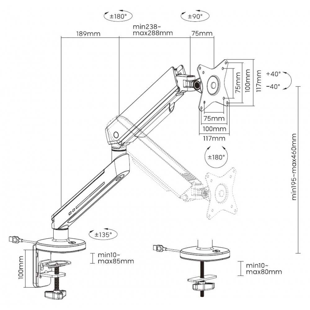 для монітора, Тип - поворотно-похилий, кількість ступенів свободи - 5, мінімальна підтримувана діагональ - 17", максимальна підтримувана діагональ - 32", VESA - 75 x 75, 100 x 100, Максимальне навантаження - 9 кг, Нахил - +40°~-40°, Поворот - +90°~-90°, Обертання - +180°~-180°, з регулюванням по висоті, для кріплення вигнутих екранів, з регулюванням глибини, з RGB підсвіткою, сірий