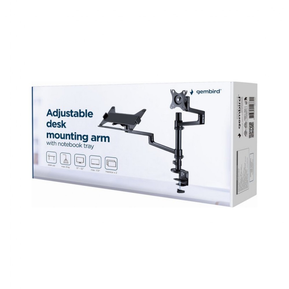 для монітора, Тип - поворотно-похилий, кількість ступенів свободи - 3, мінімальна підтримувана діагональ - 17", максимальна підтримувана діагональ - 32", VESA - 75 x 75, 100 x 100, Максимальне навантаження - 8 кг, Нахил - +90°~-30°, Поворот - +90°~-90°, Обертання - +180°~-180°, система прокладки кабелів, з лотком для ноутбука, вага - 4.62 кг, чорний