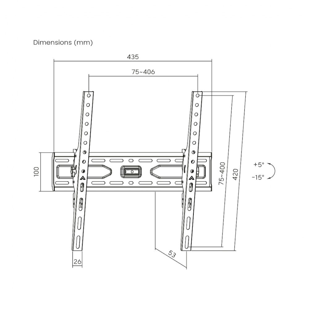 для телевізора, Тип - похилий, кількість ступенів свободи - 1, мінімальна підтримувана діагональ - 32", максимальна підтримувана діагональ - 55", VESA - 75 x 75, 100 x 100, 200 x 100, 200 x 200, 200 x 300, 300 x 200, 200 x 400, 300 x 300, 400 x 200, 400 x 300, 400 x 400, 100 x 200, 300 x 400, Максимальне навантаження - 45 кг, Нахил - +5°~-15°, відстань до стіни - 27 мм, з бульбашковим рівнем, чорний