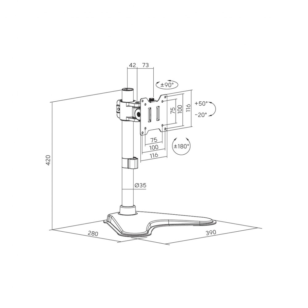 для монітора, Тип - поворотний, кількість ступенів свободи - 2, мінімальна підтримувана діагональ - 17", максимальна підтримувана діагональ - 49", VESA - 75 x 75, 100 x 100, Максимальне навантаження - 20 кг, Нахил - +50° ~ -20°, кронштейн, інструкція, монтажний комплект, чорний