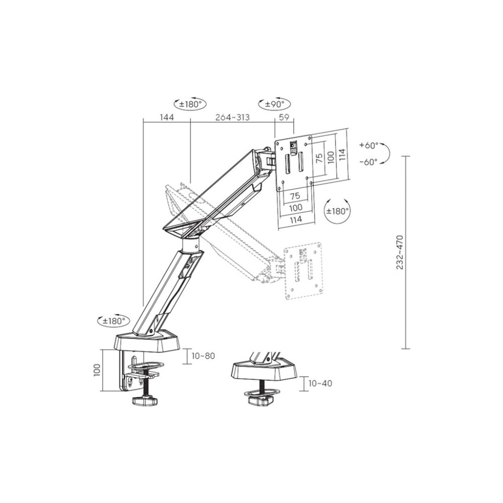 для монітора, Тип - поворотно-похилий, кількість ступенів свободи - 5, мінімальна підтримувана діагональ - 17", максимальна підтримувана діагональ - 45", VESA - 75 x 75, 100 x 100, Максимальне навантаження - 16 кг, Нахил - +60°~-60°, Поворот - +90°~-90°, Обертання - +180° ~ -180°, з регулюванням по висоті, для кріплення вигнутих екранів, з прихованим укладанням дротів, обертання: ±180°, з регулюванням глибини, сірий