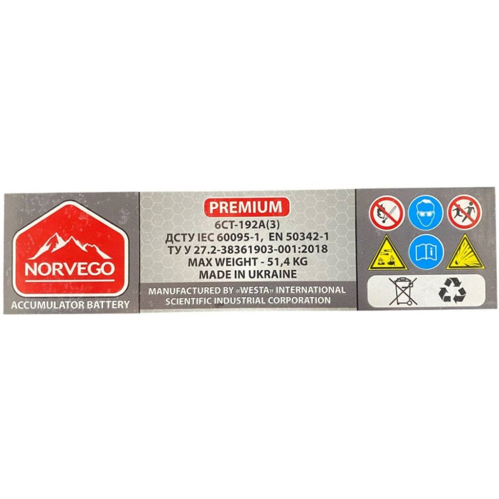 Акумулятор автомобільний NORVEGO ВЕСТА Premium 192A +лів (3) (1350 пуск)