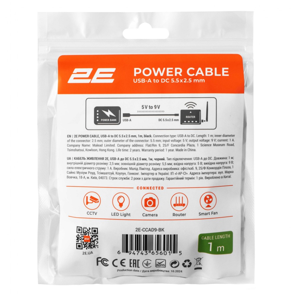Кабель живлення USB to DC 5.5x2.1mm 9V 1.0m 1.0A 2E (2E-CCAD9-BK)