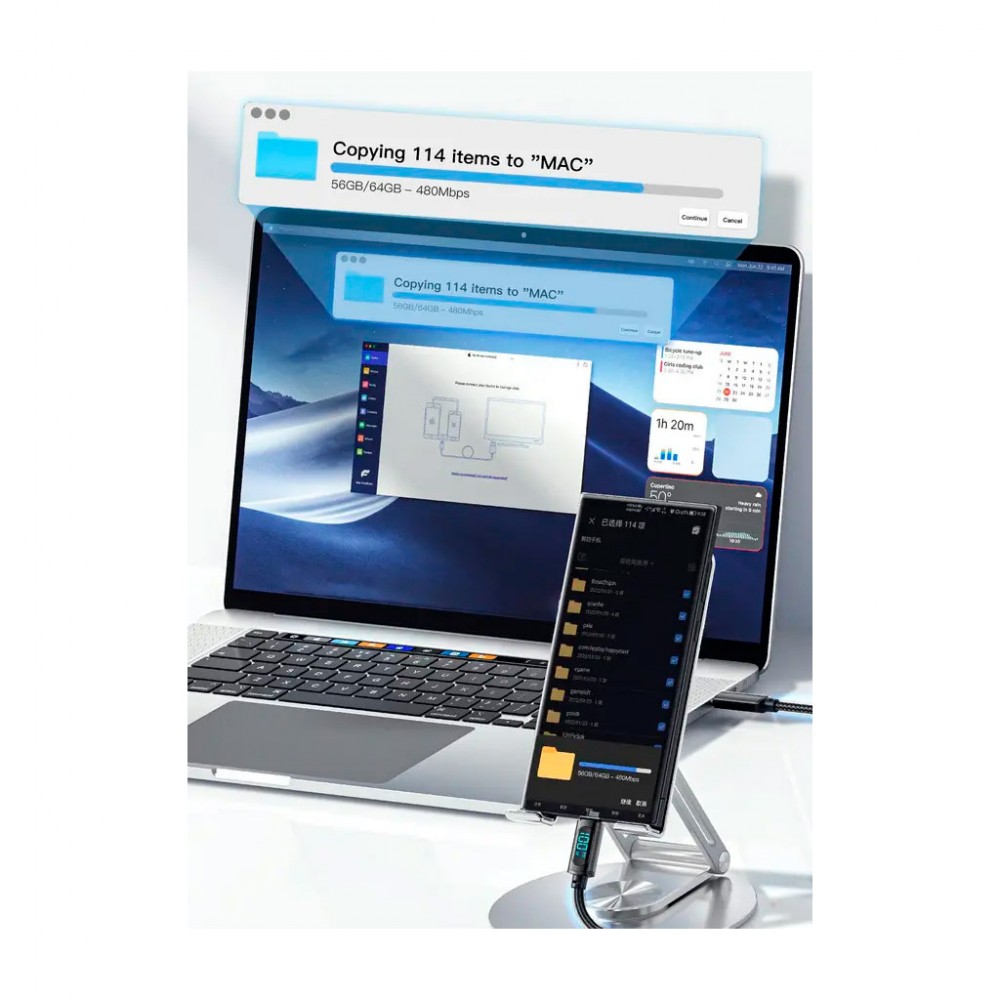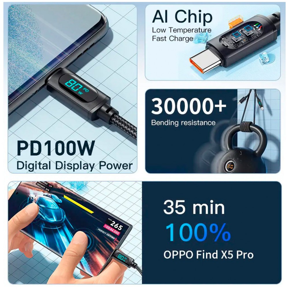 LED-індикатор потужності заряду, максимальна швидкість передачі даних: 480 МБ/с, нейлонове покриття, тканинне обплетення, Цифровий дисплей для контролю за споживаною потужністю