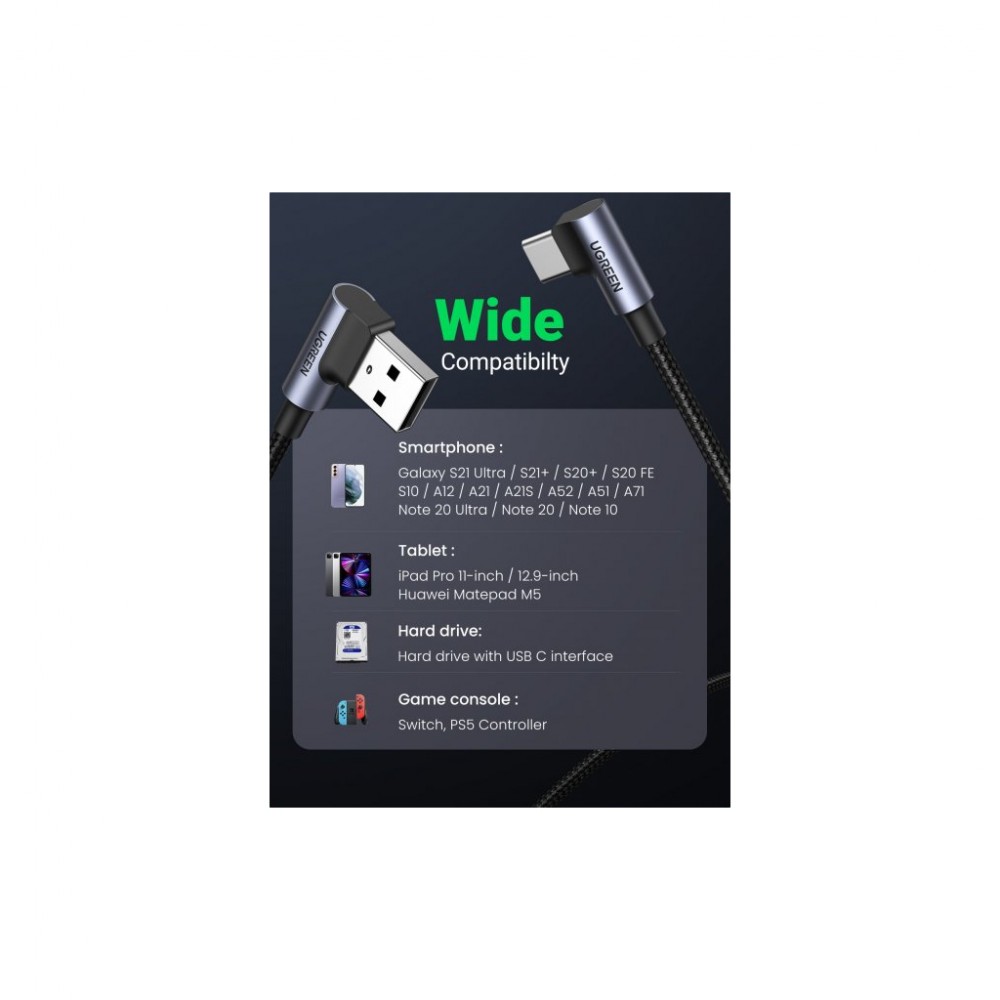 Дата кабель USB 2.0 AM to USB-C 1.0m 3A 90° corner US176 black Ugreen (20856)